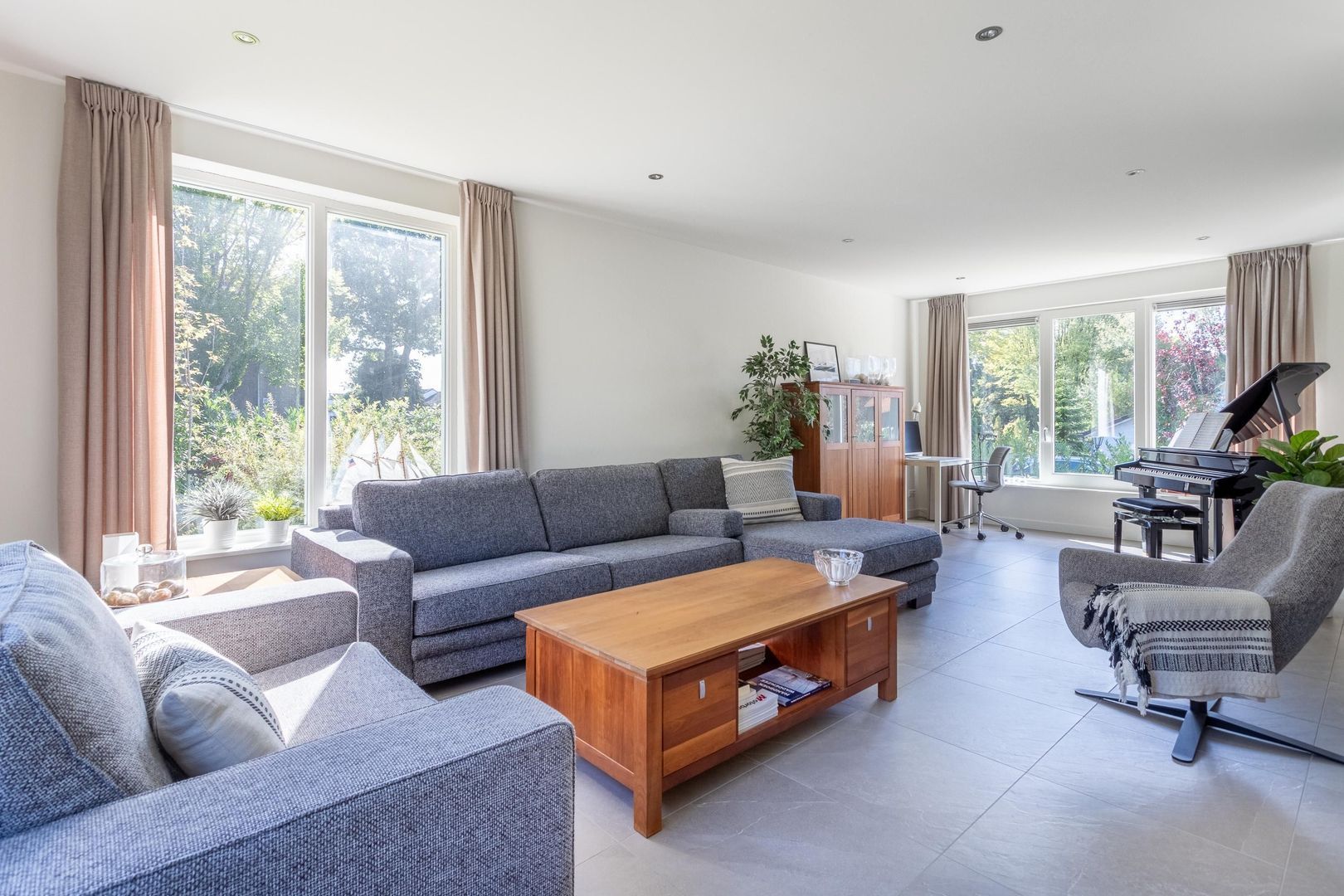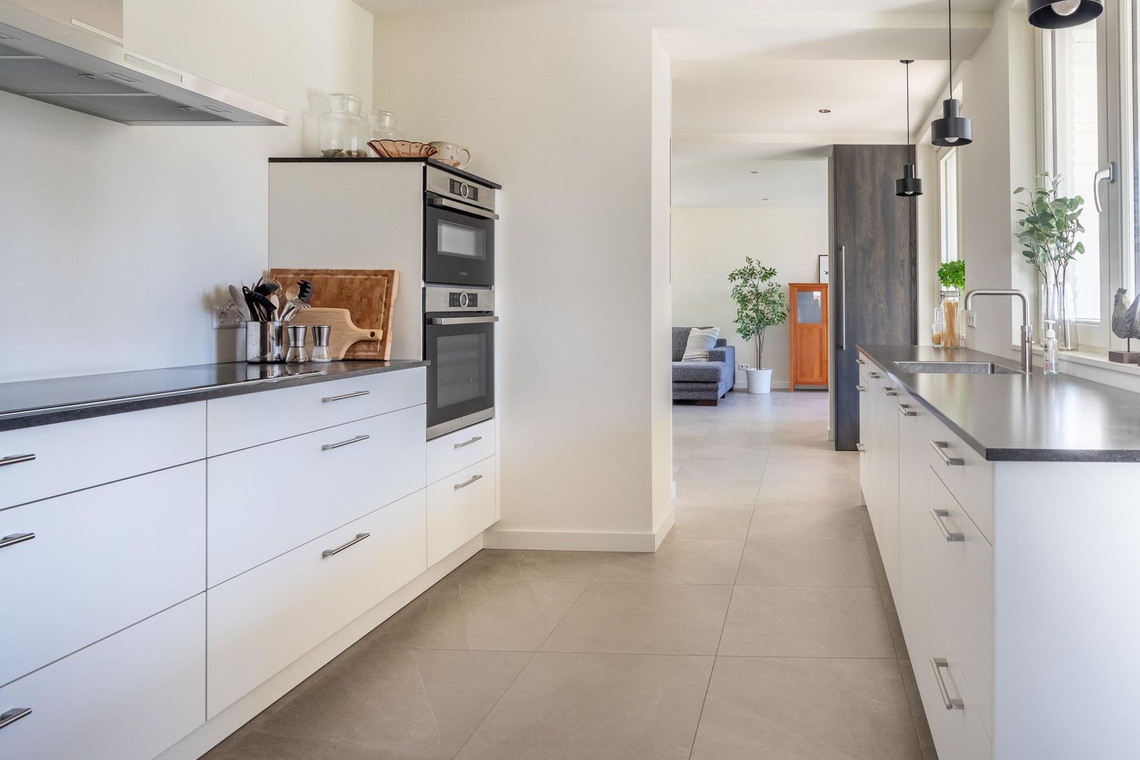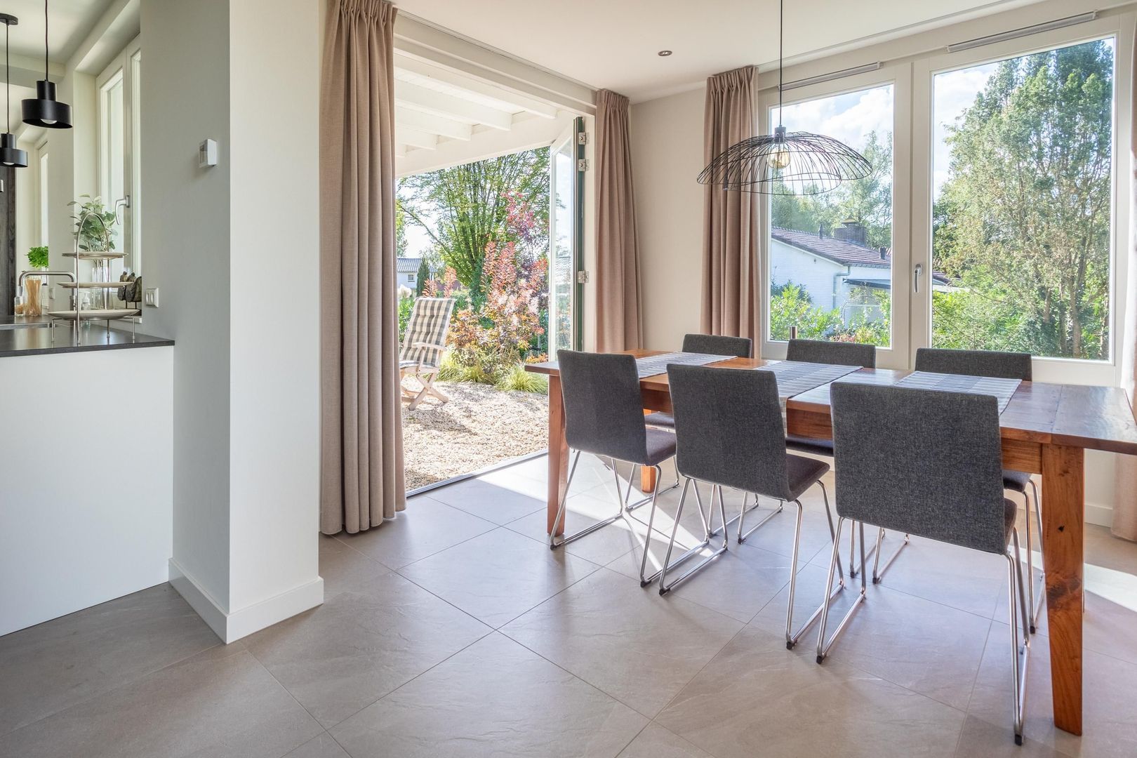 Doordat woonkamer, keuken en eetkamer in elkaar overlopen, ontstaat een samenhangende leefruimte met prettige zichtlijnen en een natuurlijke verbinding met de overkapping buiten. Tegelijkertijd heeft elke ruimte door de indeling en afwerking een eigen karakter, waardoor er naast openheid ook een gevoel van geborgenheid aanwezig blijft.