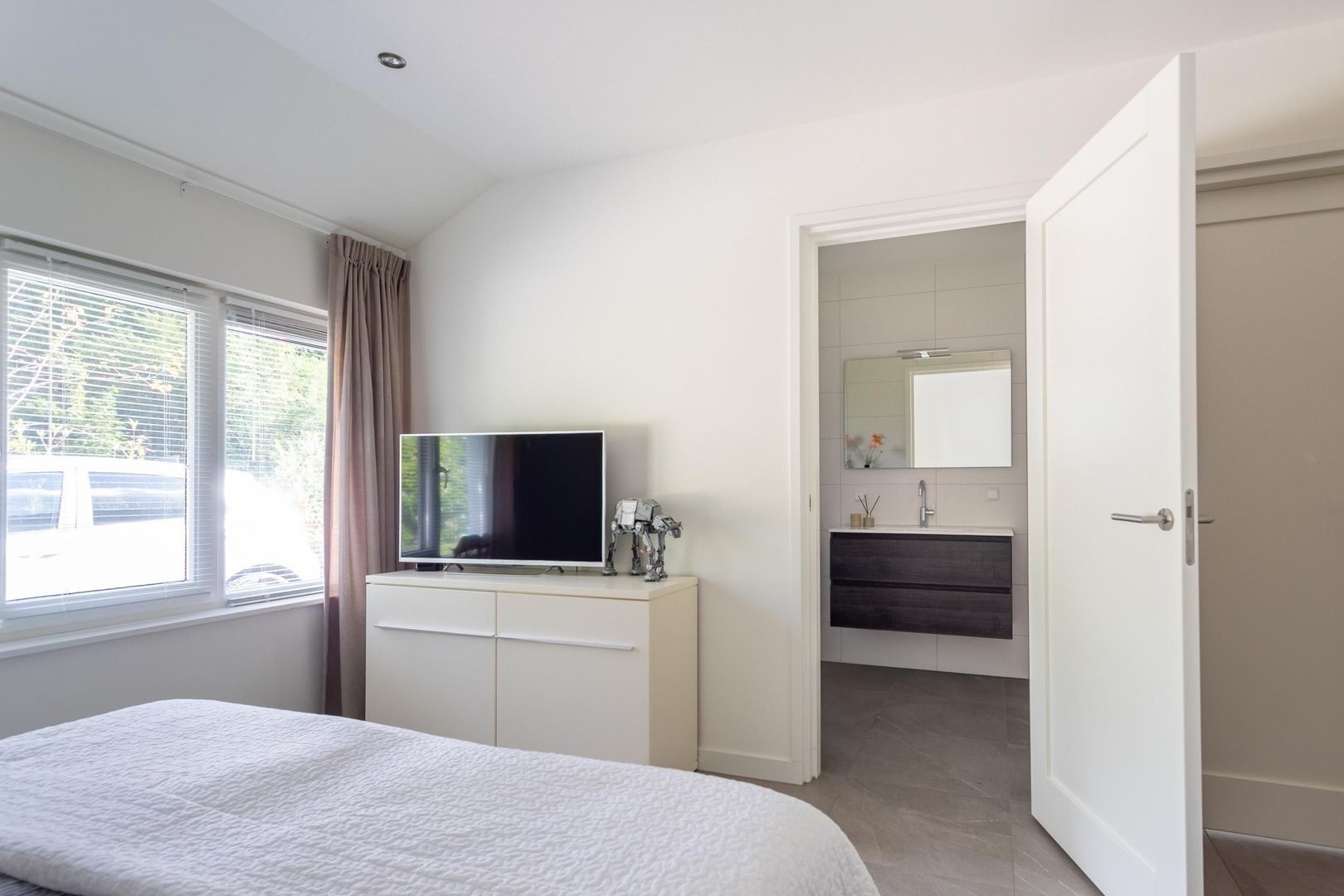 De slaapkamer met badkamer en suite biedt alles wat je nodig hebt. Dankzij de kastenwand is er voldoende opbergruimte en de badkamer is strak ingericht. Vanuit de royale ontvangsthal is er toegang tot de kelder op stahoogte en ook naar de ruime bevloerde zolderverdieping die verschillende gebruiksmogelijkheden heeft.