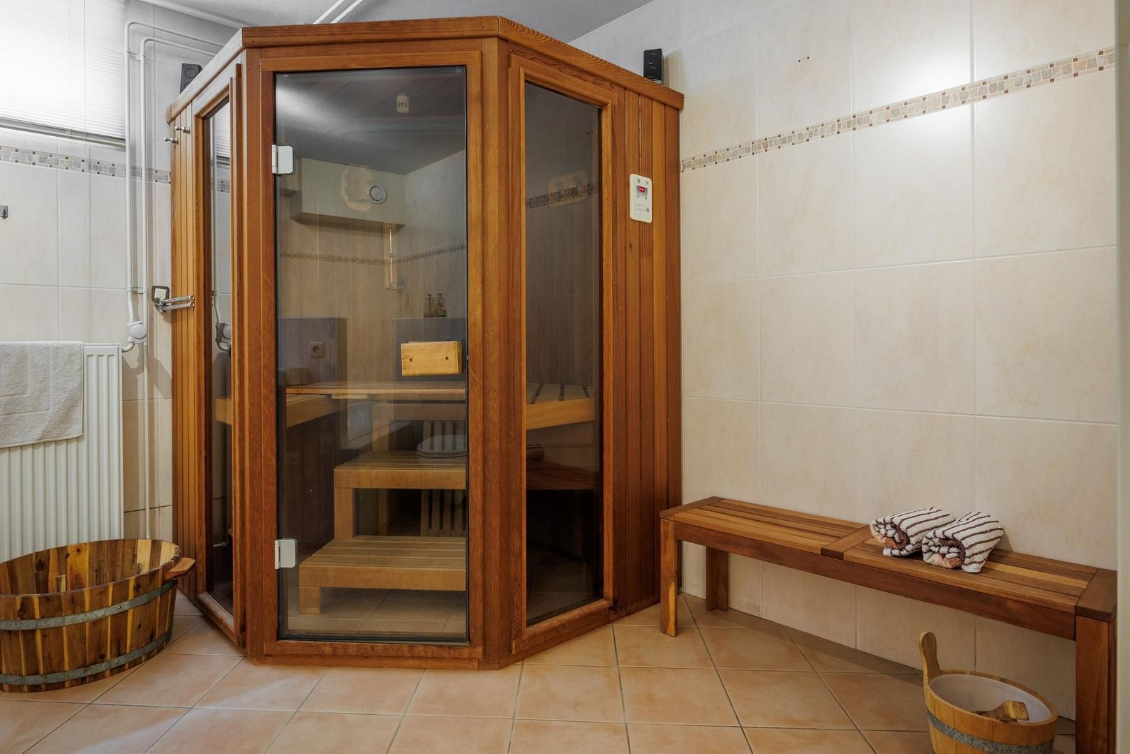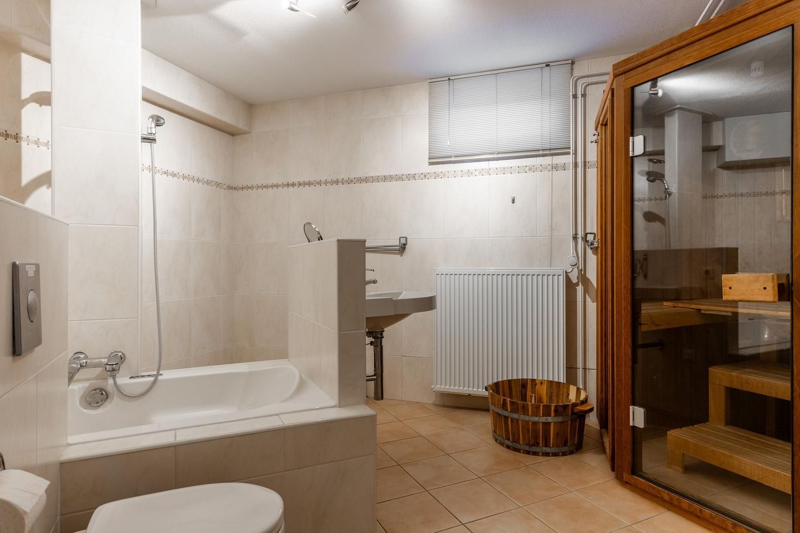 En dan het souterrain. Een fijne ruimte die opgedeeld is in een grote open ruimte, ideaal als werkplek, hobby- en/of sportruimte. Een aparte kamer die tevens toegang geeft tot de derde ruimte van het souterrain, de wellness. De wellness is voorzien van een sauna, ligbad, douche, wastafel en toilet.