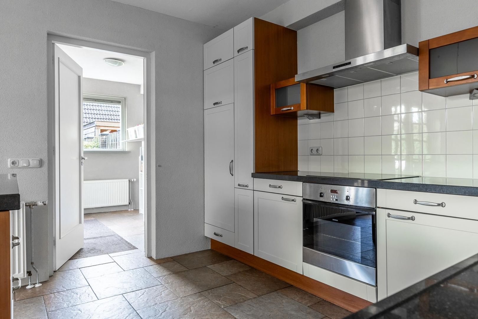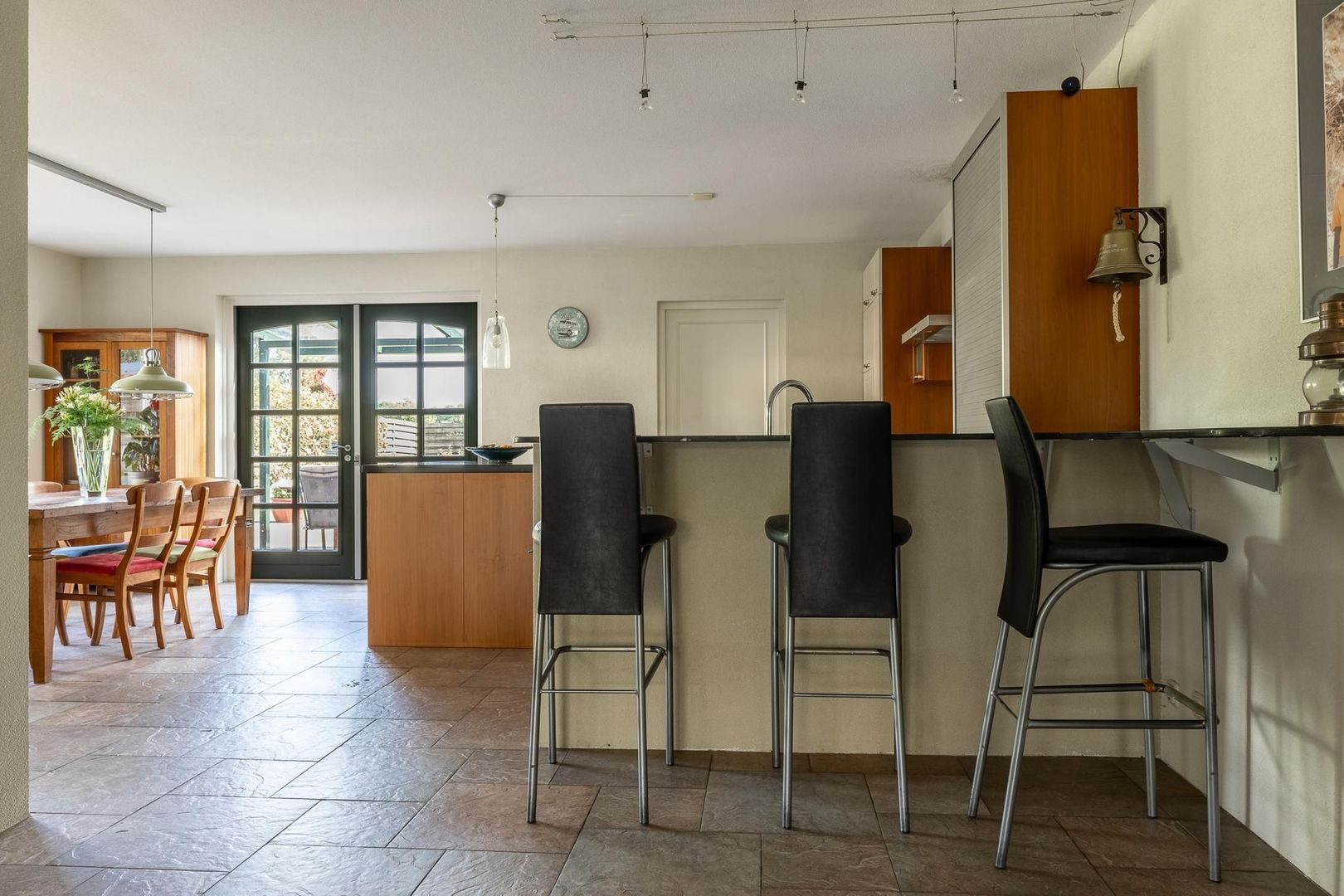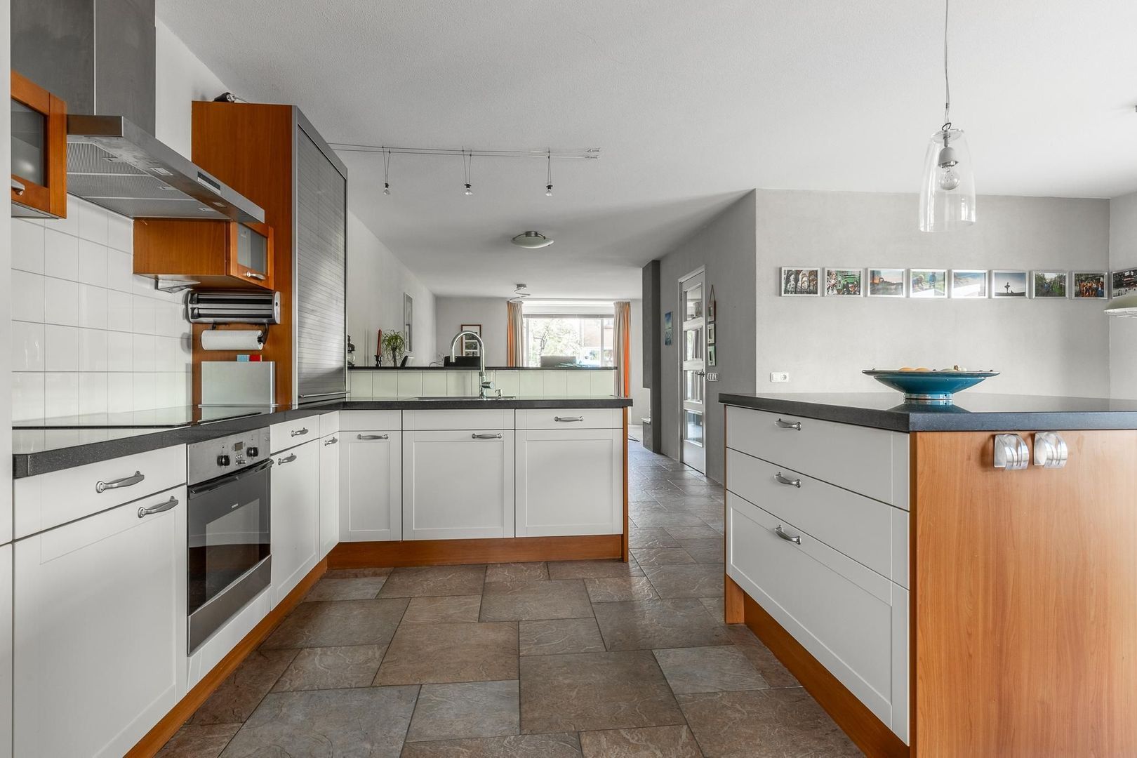 De woonkeuken bevindt zicht aan de achterzijde van de woning. Ruim van opzet en voorzien van alle benodigde inbouwapparatuur, dit is de plek waar je heerlijke maaltijden kunt bereiden. De openslaande deuren leiden naar het terras, waardoor binnen- en buitenleven naadloos in elkaar overlopen. De aansluitende bijkeuken biedt extra opbergruimte en is voorzien van de witgoedaansluitingen. Onder de bijkeuken bevindt zich nog een wijn-/voorraadkelder.