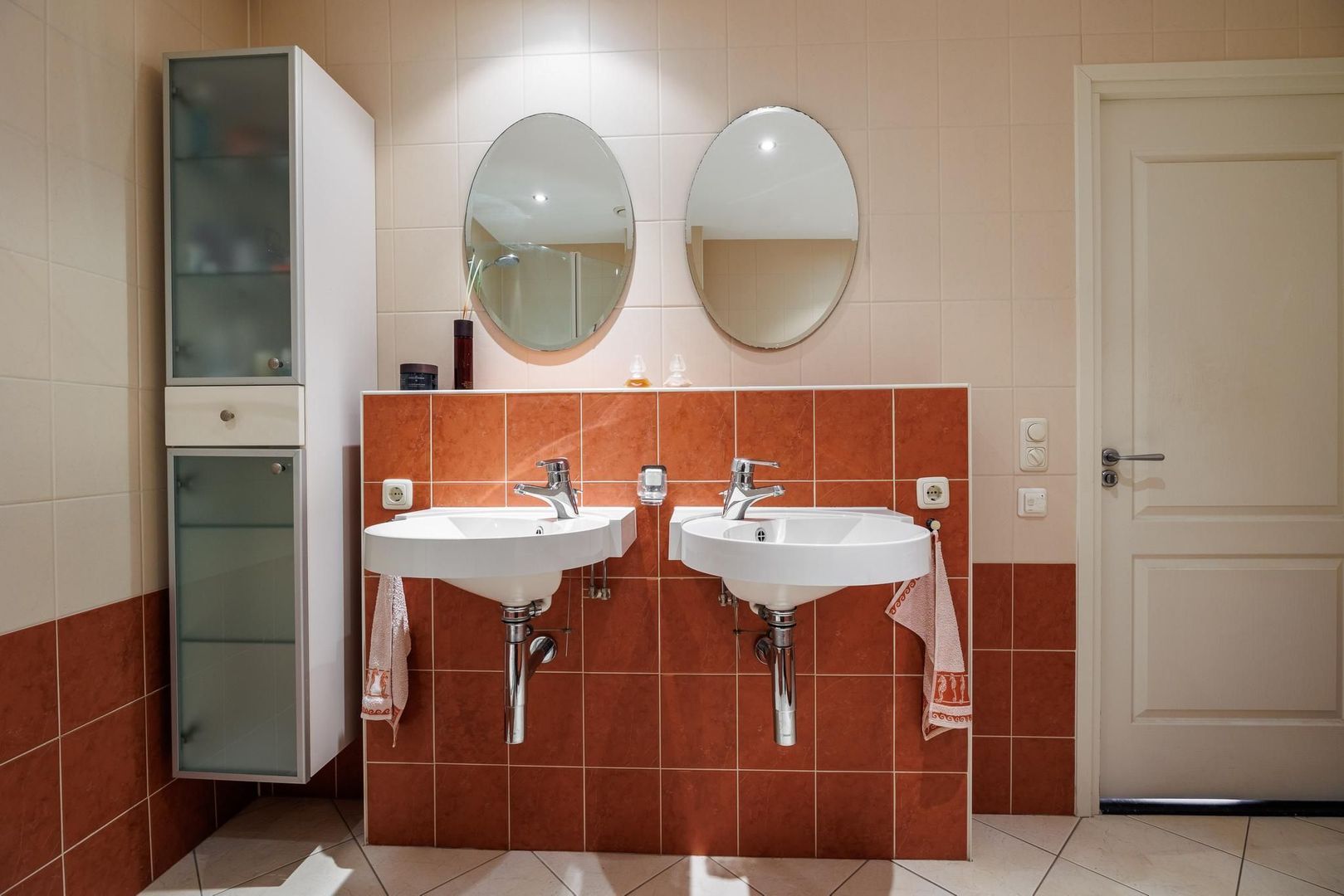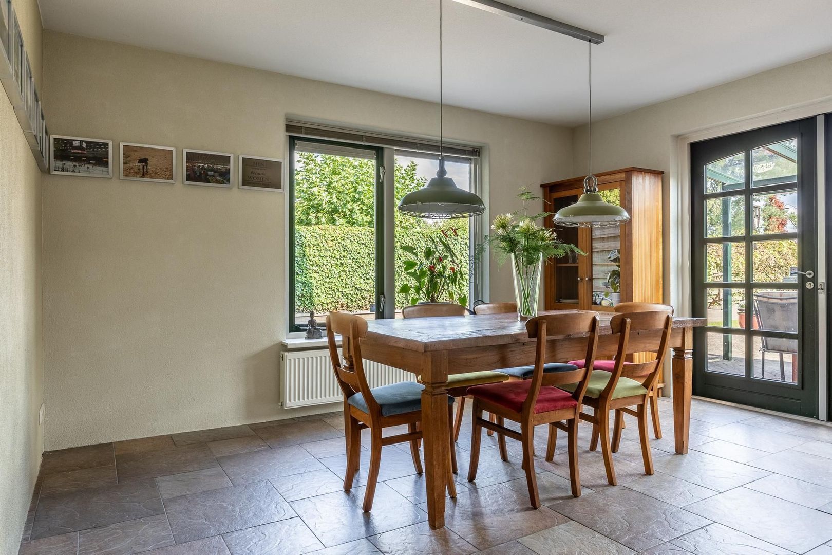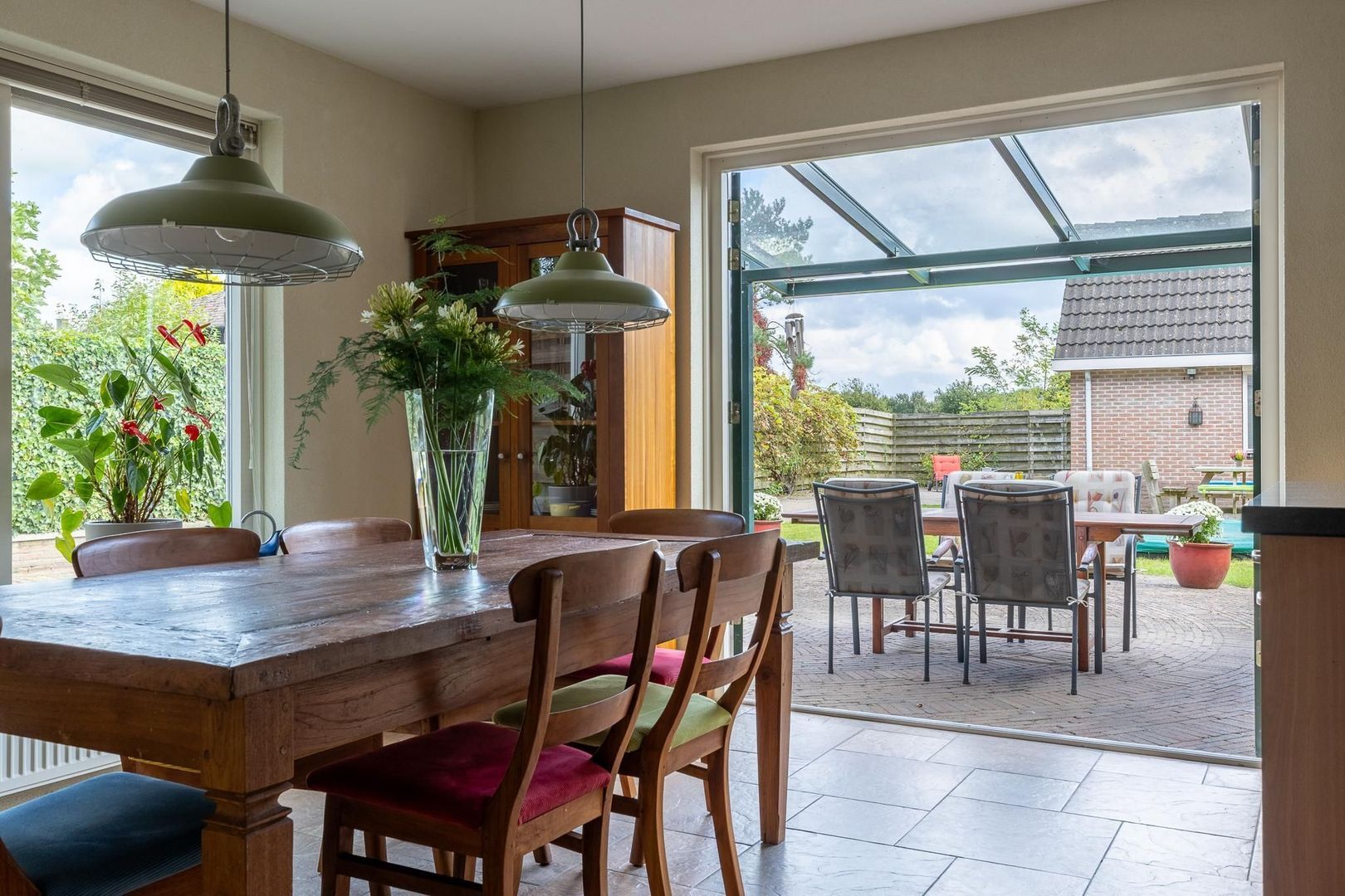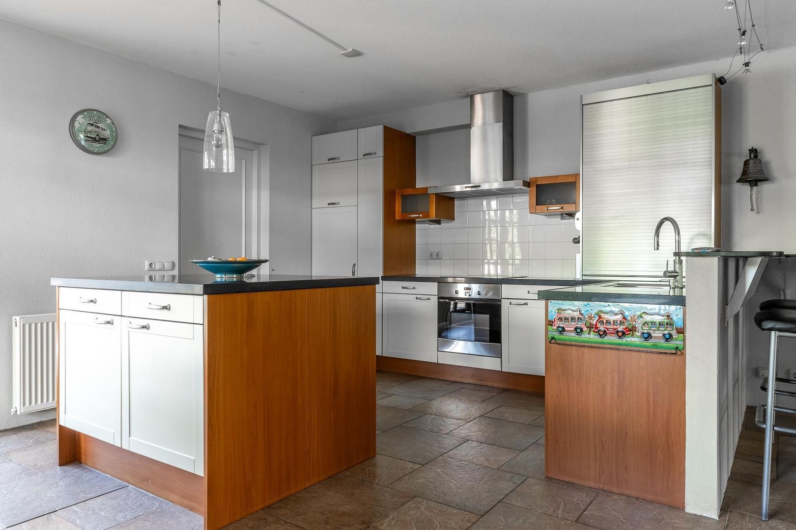 De woonkeuken bevindt zicht aan de achterzijde van de woning. Ruim van opzet en voorzien van alle benodigde inbouwapparatuur, dit is de plek waar je heerlijke maaltijden kunt bereiden. De openslaande deuren leiden naar het terras, waardoor binnen- en buitenleven naadloos in elkaar overlopen. De aansluitende bijkeuken biedt extra opbergruimte en is voorzien van de witgoedaansluitingen. Onder de bijkeuken bevindt zich nog een wijn-/voorraadkelder.