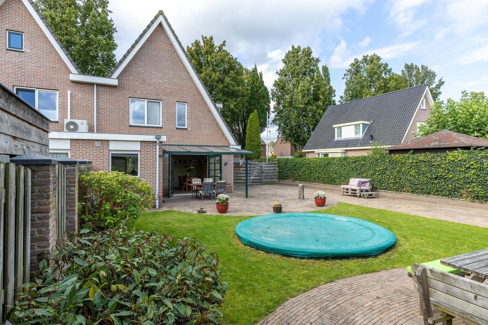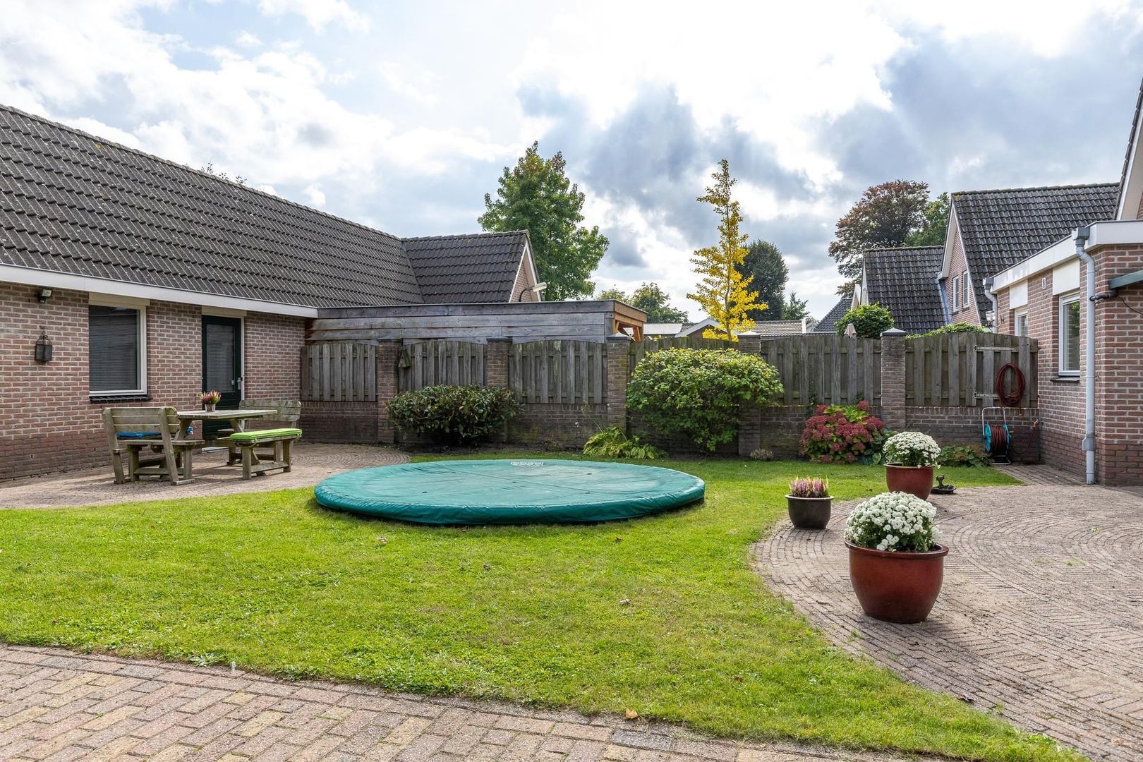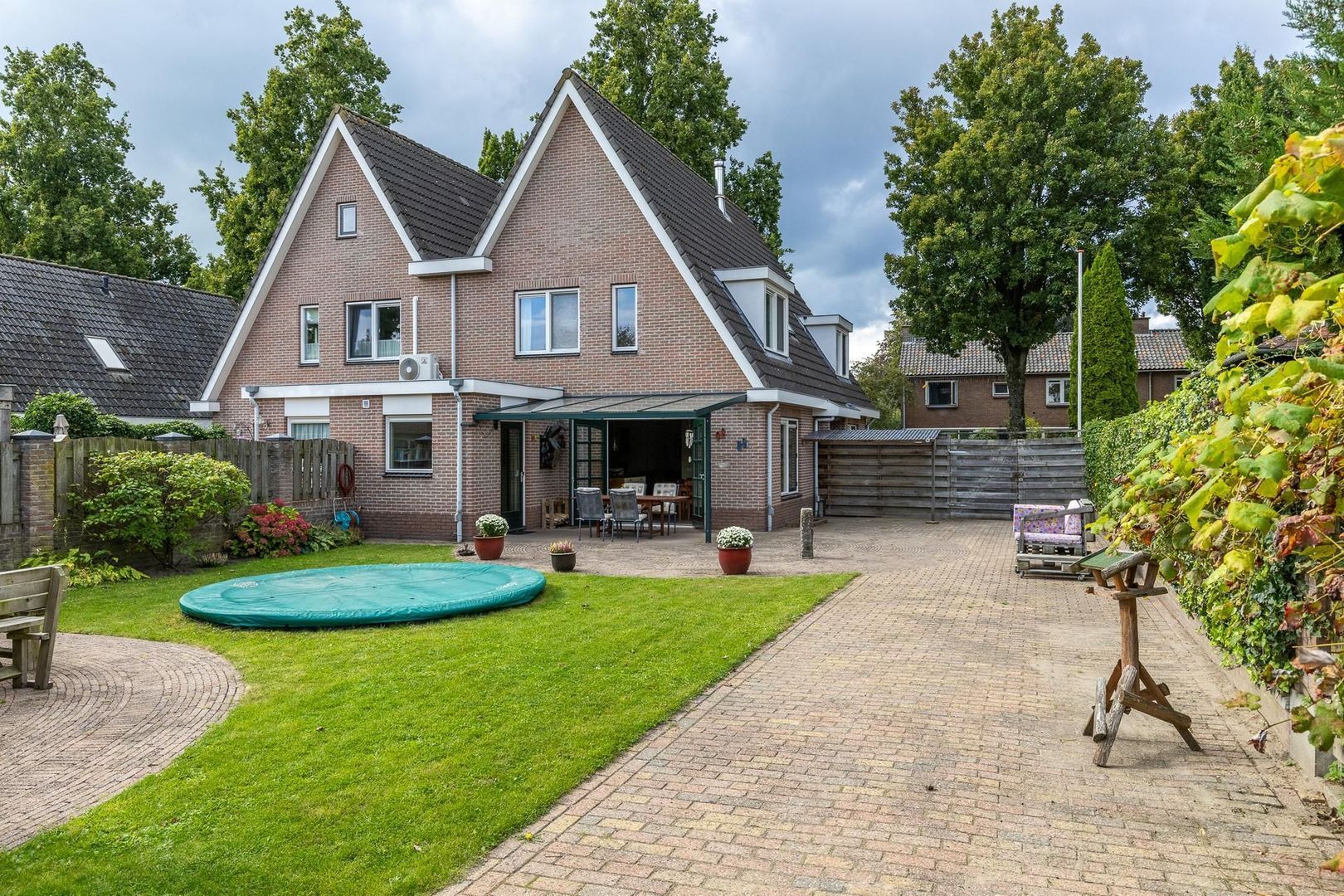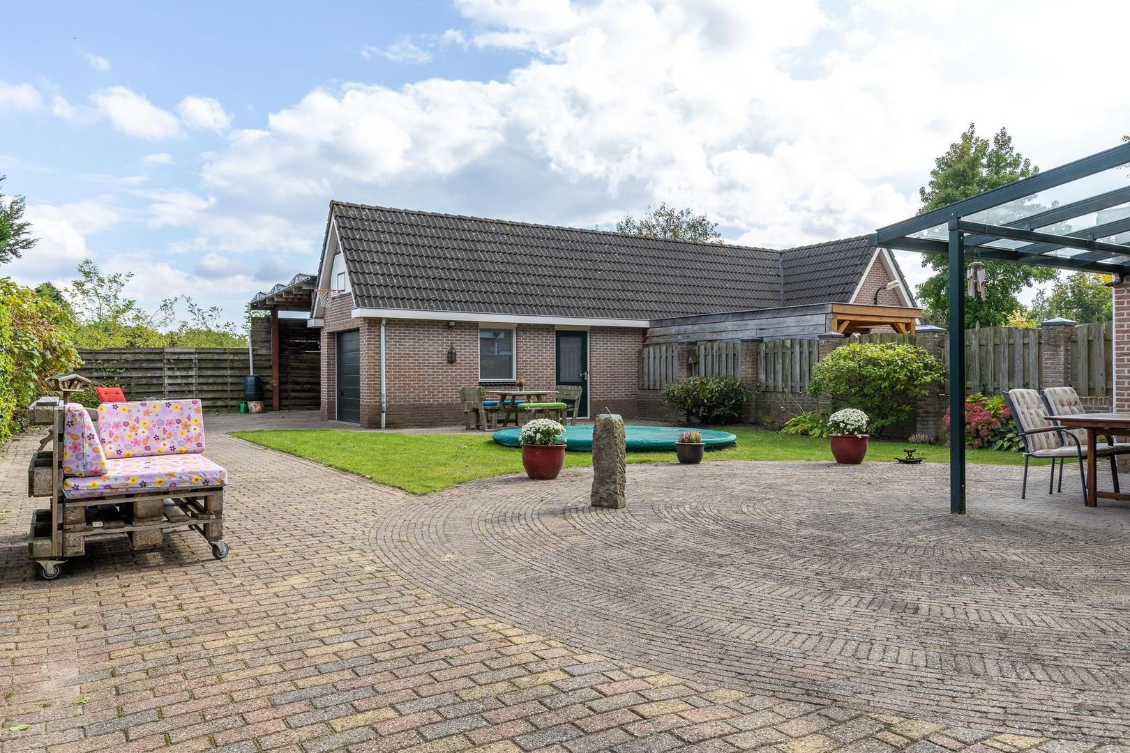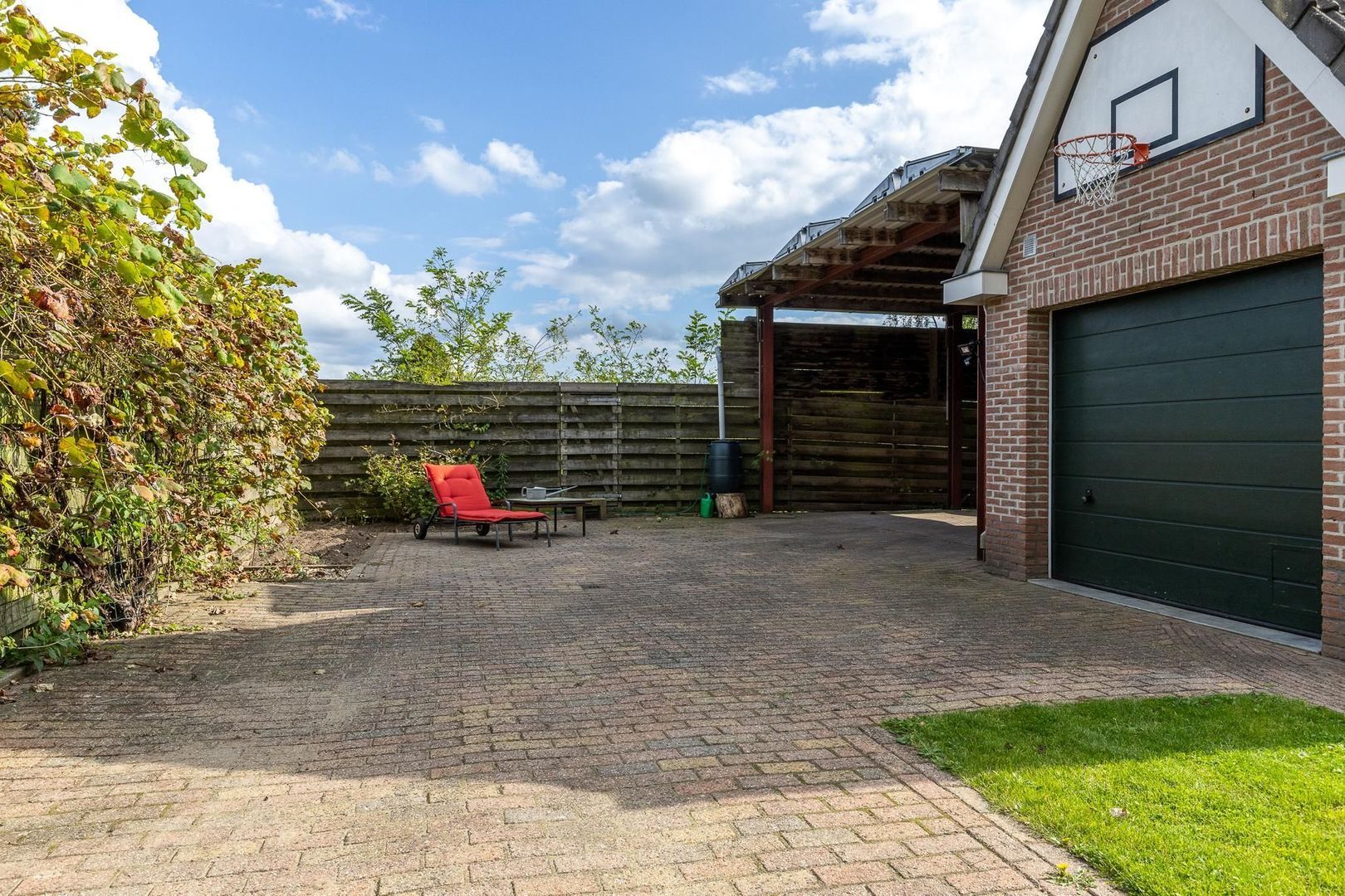 Achter in de tuin staat de garage met ruime zolder. Daarachter bevindt zich, onzichtbaar van het huis, een hele grote carport met zonnepanelen, geschikt voor stalling op eigen terrein.