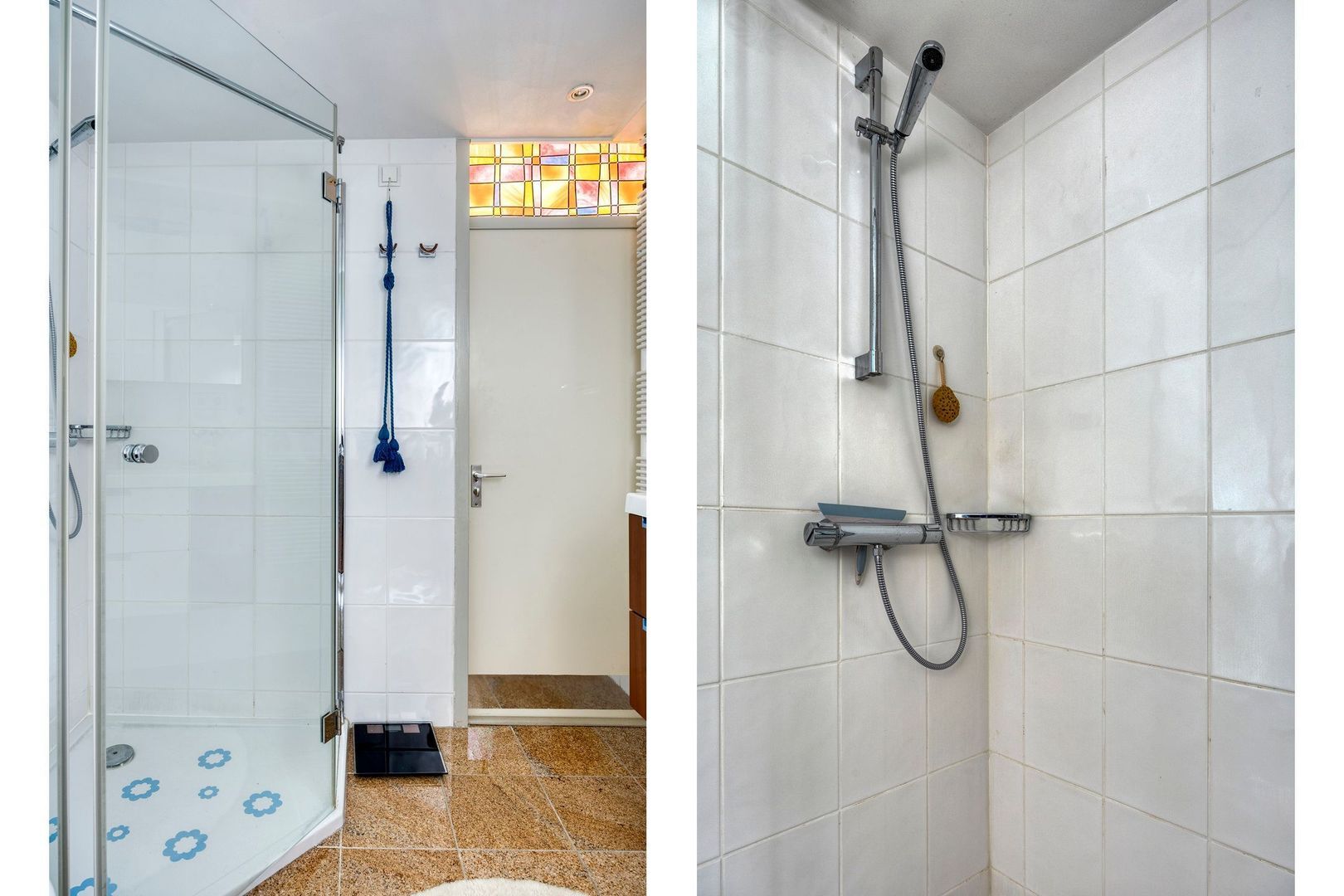 Op de eerste verdieping bevinden zich drie lichte slaapkamers, waaronder de ouderslaapkamer met een dakkapel en een op maat gemaakte kast. De badkamer is uitgevoerd in een lichte kleurstelling en beschikt over een douche, een wastafelmeubel, een toilet én een extra vaste schuifkast (inclusief wasmachineaansluiting), wat zorgt voor praktische bergruimte.