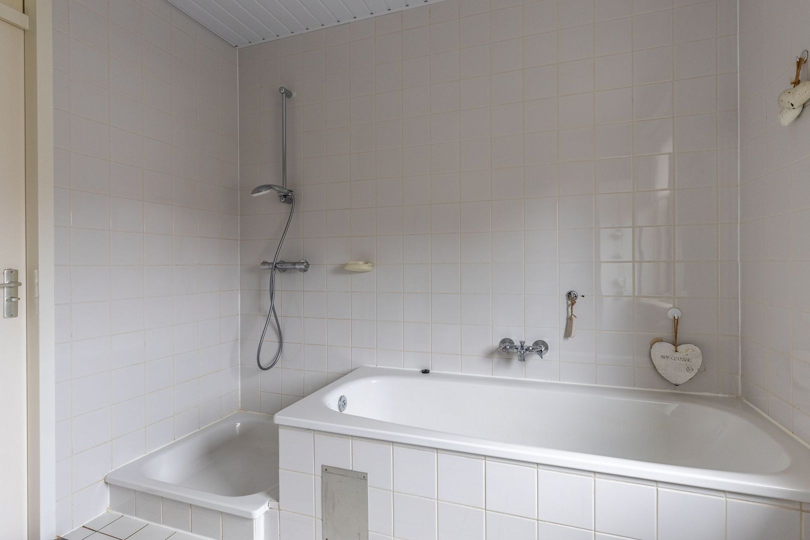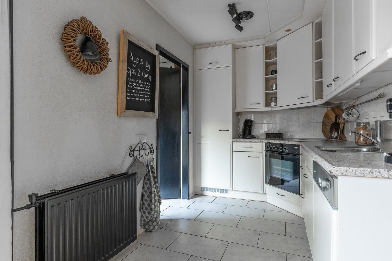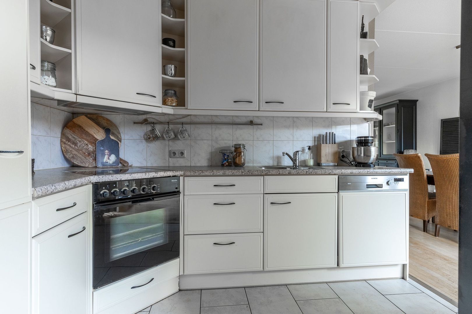 De halfopen keuken is voorzien van een lichte keukenopstelling inclusief inbouwapparatuur. De doorloop naar de bijkeuken maakt het dagelijks leven extra praktisch, met voldoende ruimte voor de wasmachine, droger en extra bergruimte.