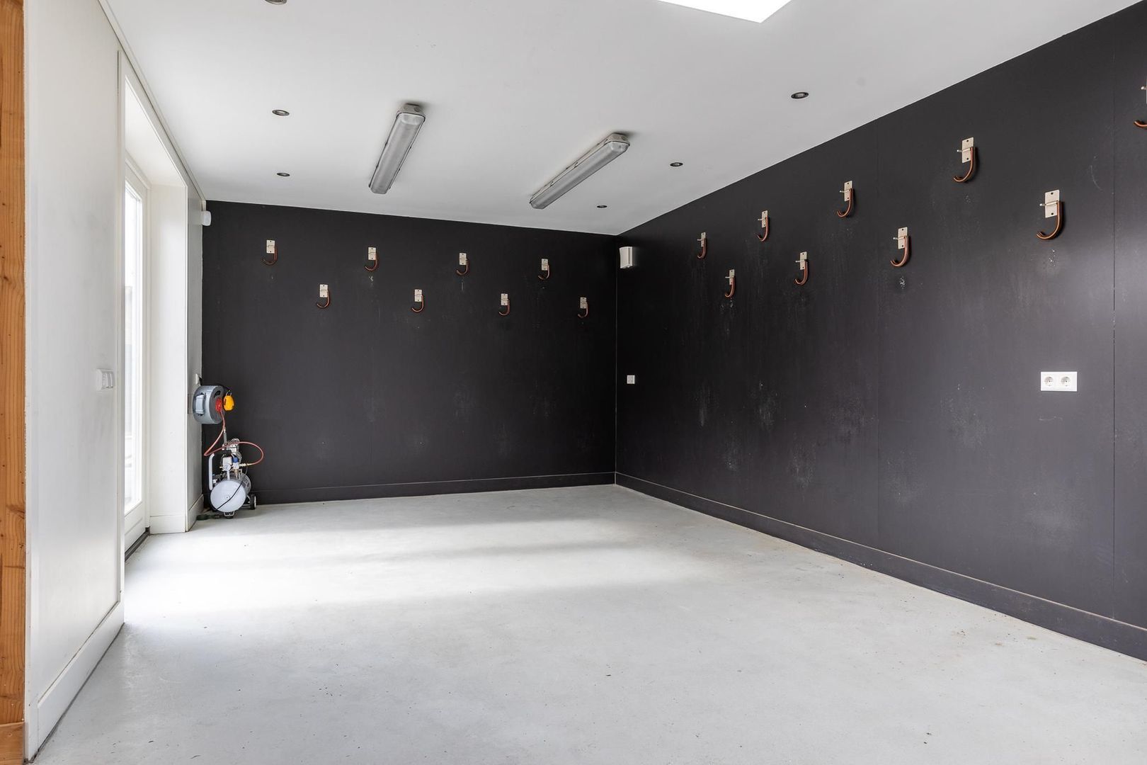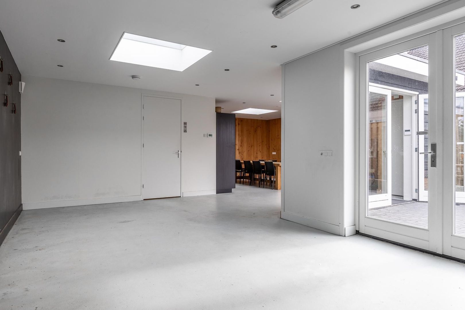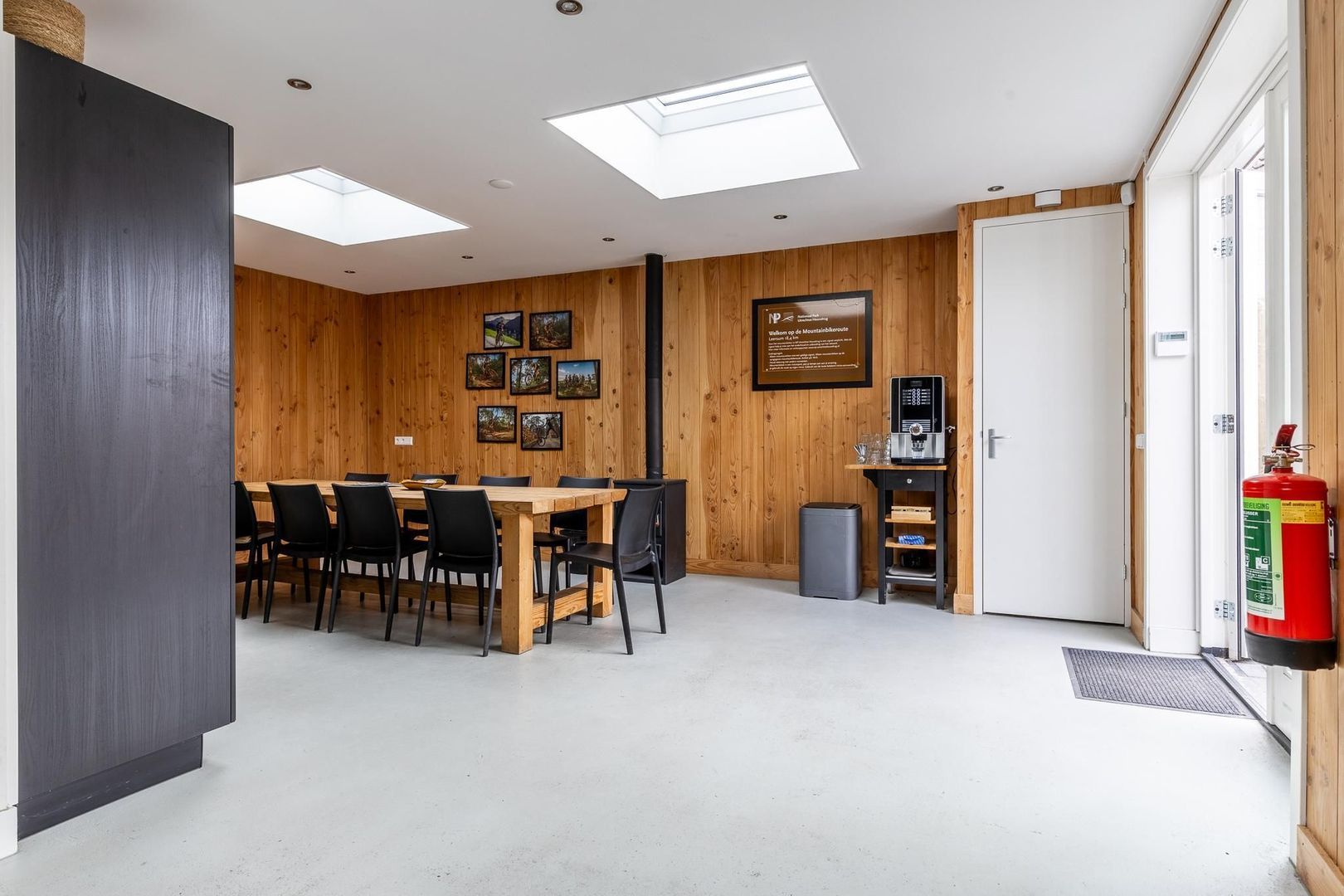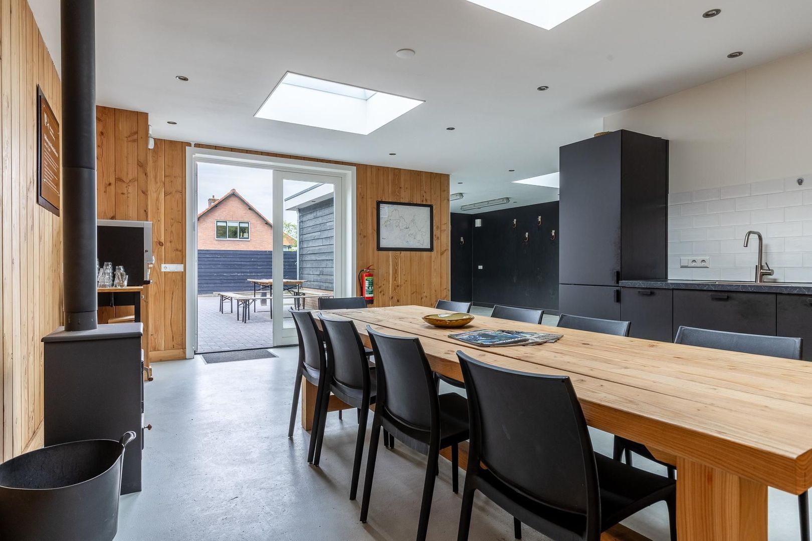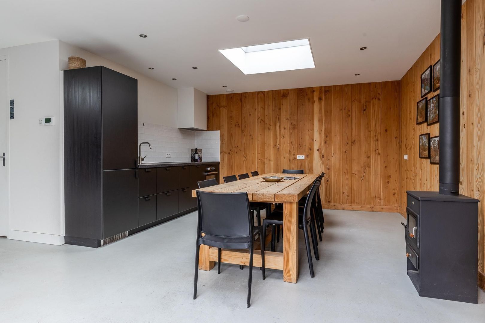 Je stapt binnen in een grote, en door het plaatsen van de lichtkoepels, lichte open ruimte voorzien van een strakke keukenopstelling (2021) met inductiekookplaat, afzuigkap, combimagnetron, koelkast, vriezer en vaatwasser. Ook zie je hier een sfeervolle houtkachel met openslaande deuren naar het terras. Vervolgens kom je in een aparte ruimte, nu in gebruik als kleedruimte inclusief 2 toiletruimtes, 2 doucheruimtes en de aansluiting voor de wasmachine.
