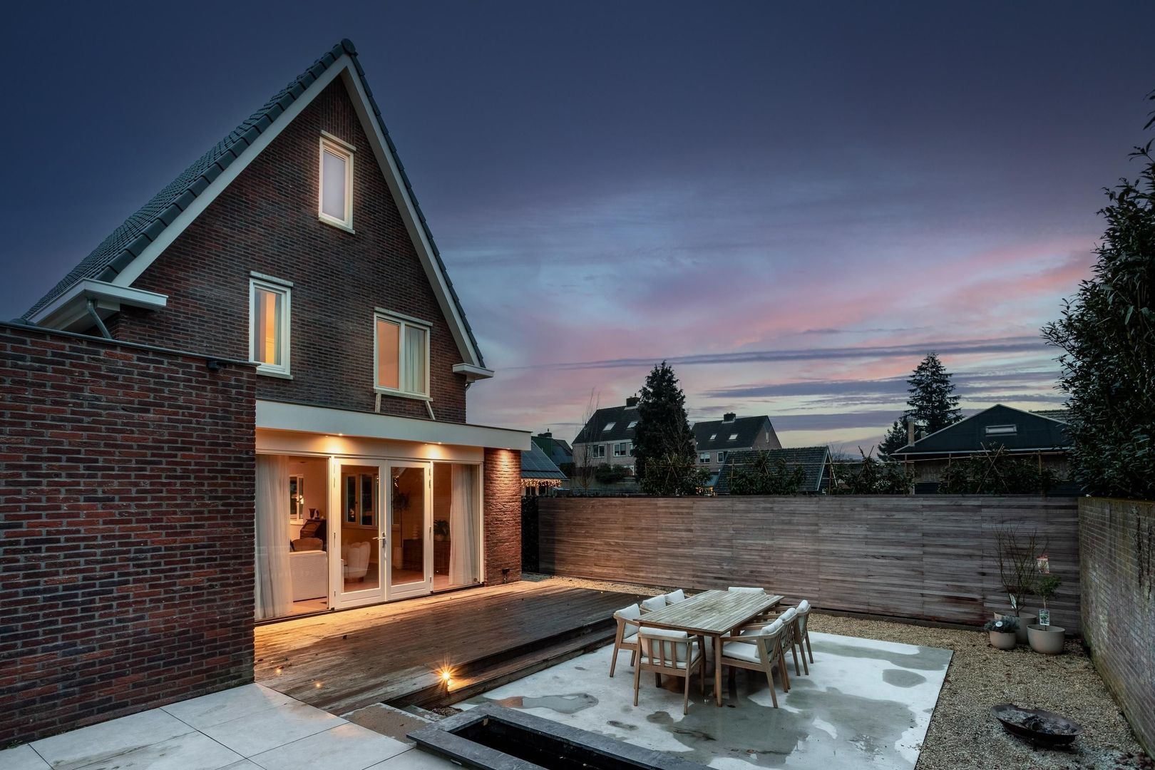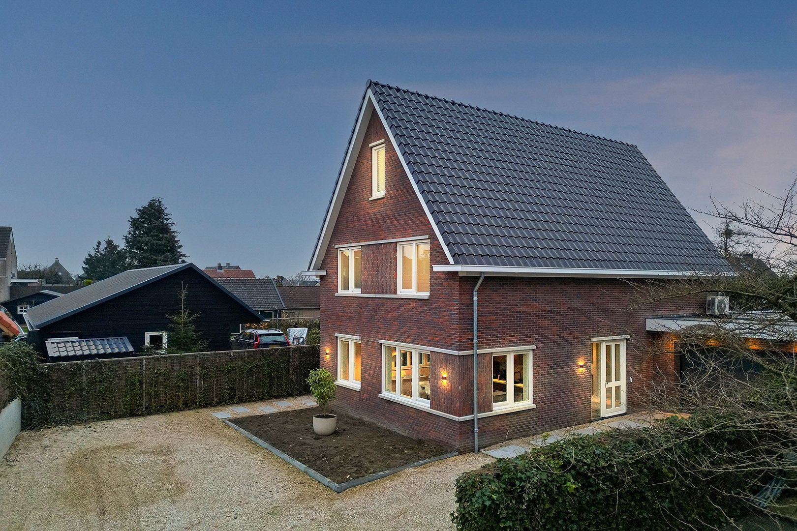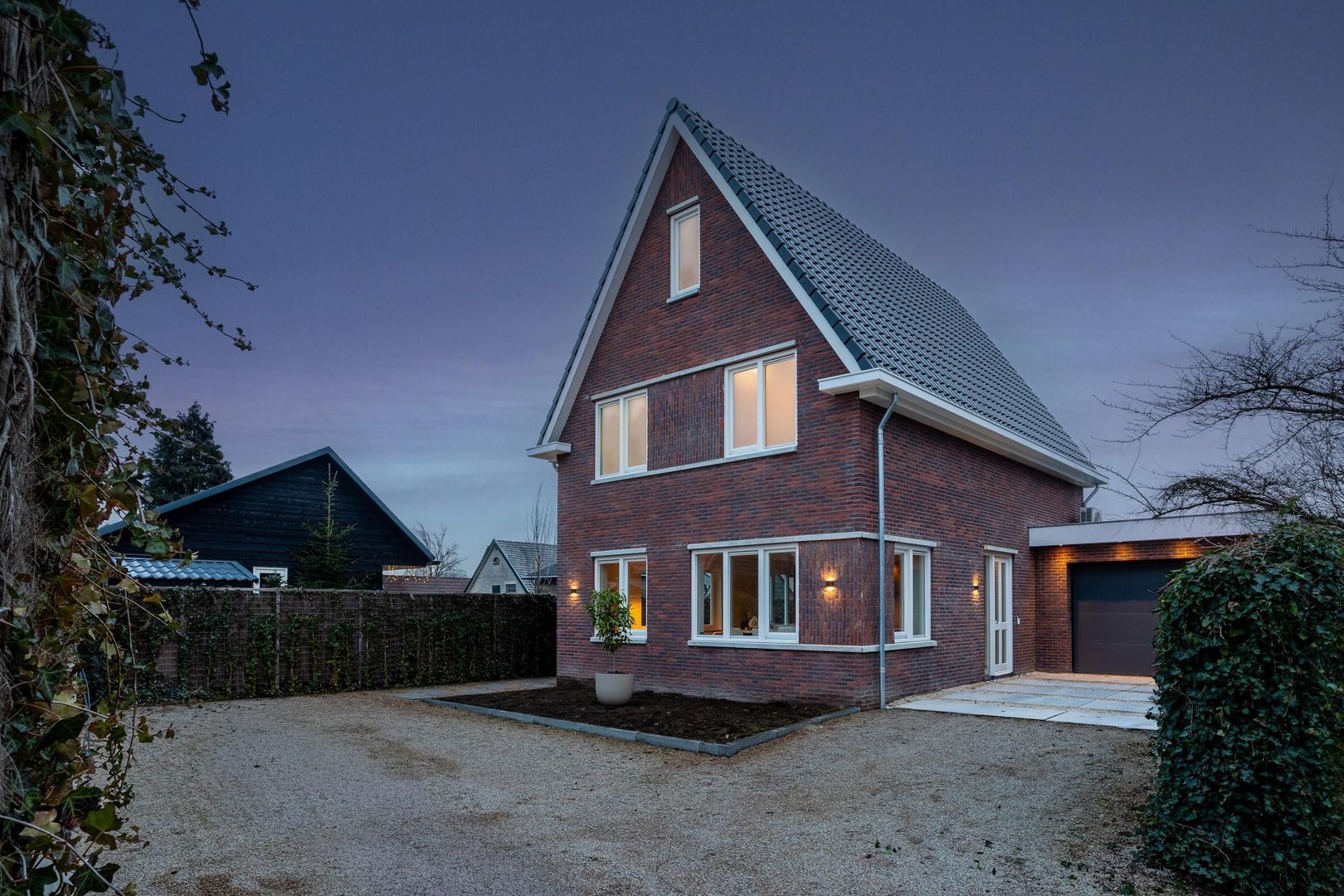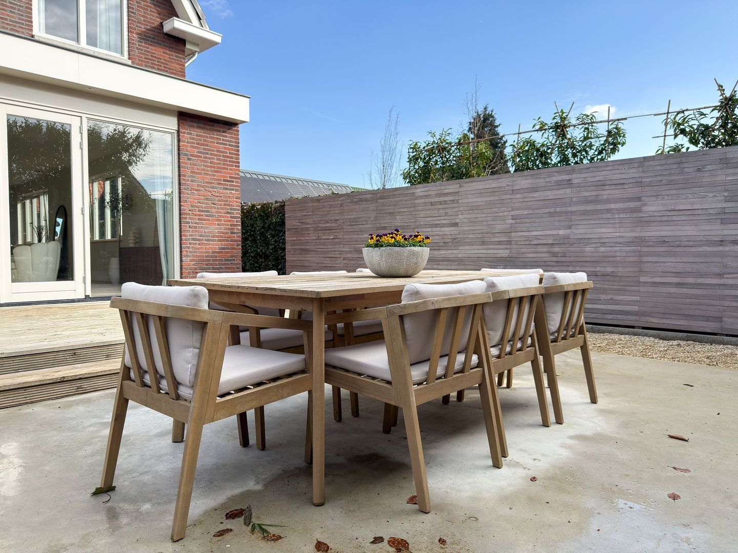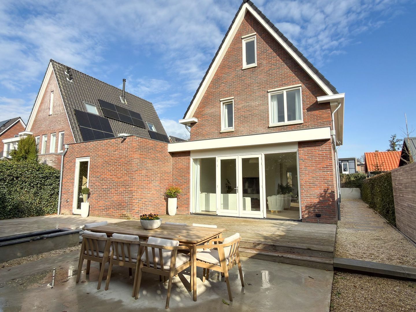 Buiten leef je minstens zo prettig. Via de openslaande deuren in de woonkamer stap je op het terras waar je een loungehoek kwijt kunt. Een niveau lager ligt een groot, strak aangelegd terras voor een grote buitentafel. De erfafscheiding met schutting en groen geeft veel privacy, waardoor je beschut zit en volop kunt genieten van lange avonden buiten. Rondom de woning is de tuin onderhoudsvriendelijk aangelegd. Parkeren kan op eigen terrein op de oprit of in de aangebouwde garage. De garage biedt plek voor zowel een auto, als fietsen en extra opslag van bijvoorbeeld tuingereedschap.