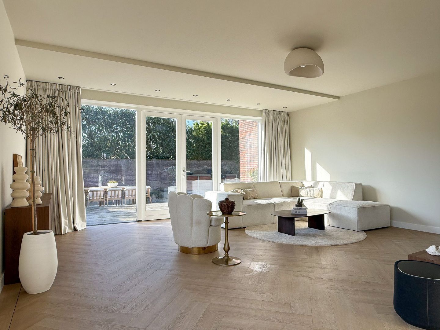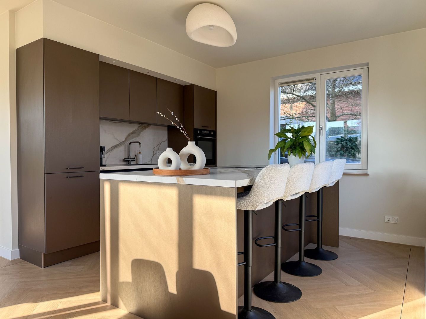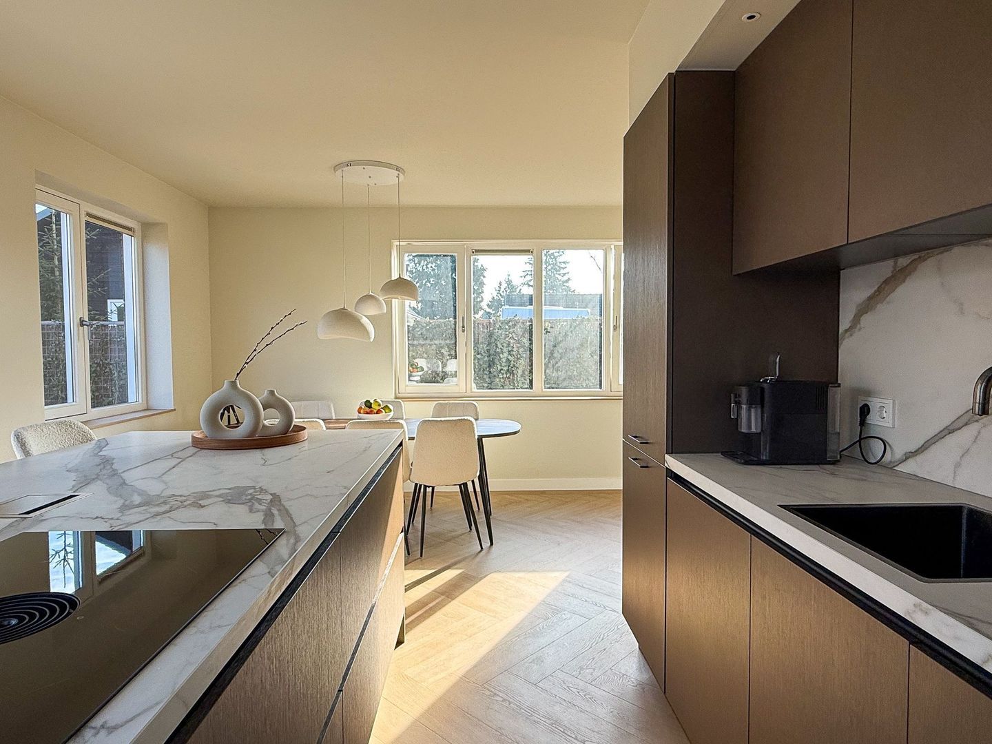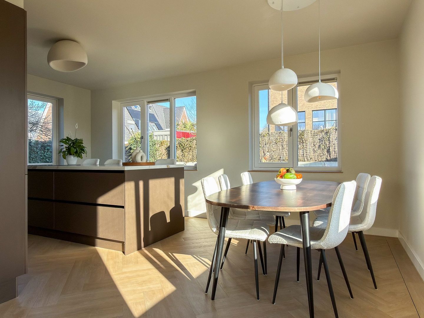 Binnen merk je direct dat alles nieuw is en met zorg is ingericht. De begane grond is één grote leefruimte met vloerverwarming en visgraatvloer, strakke strak afgewerkte wanden en grote ramen. Aan de voorzijde ligt de luxe keuken met kookeiland, voorzien van moderne inbouwapparatuur en veel werk- en bergruimte. Hier kun je uitgebreid koken terwijl je gasten aan het bargedeelte of aan de eettafel aanschuiven. De eetkamer loopt mooi over in de woonkamer aan de tuinkant, waar de openslaande deuren naar het terras zorgen voor extra licht en een directe verbinding met buiten. Het geheel voelt ruim, rustig en comfortabel.