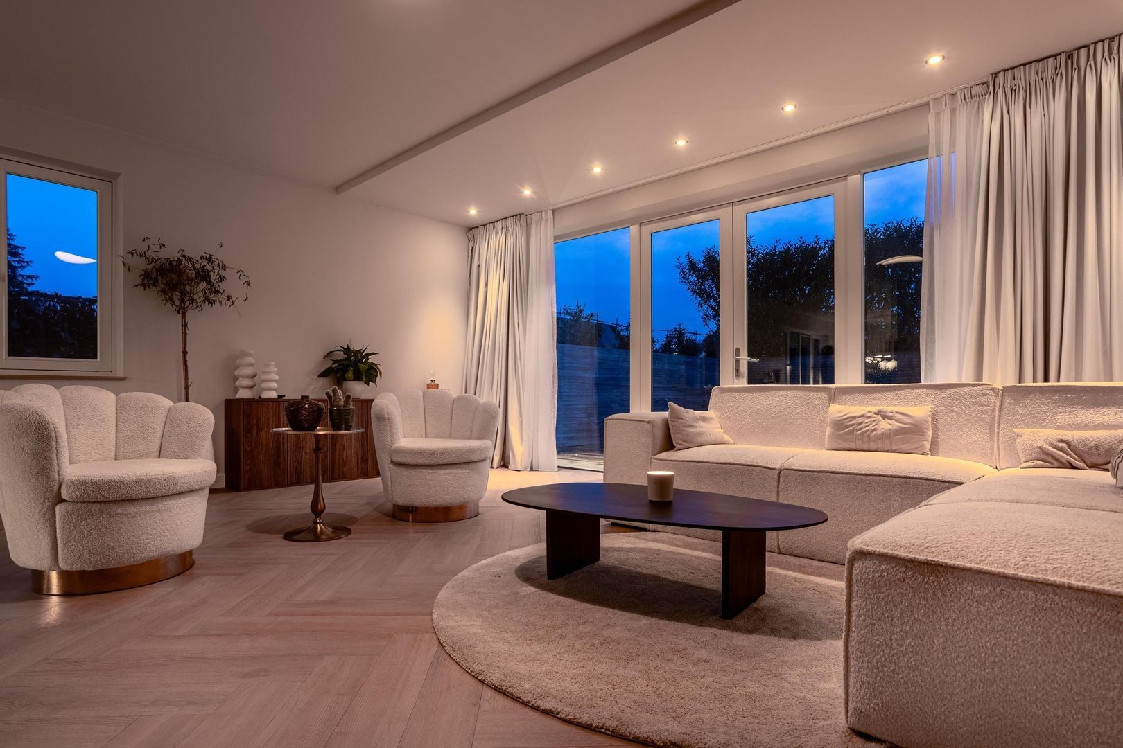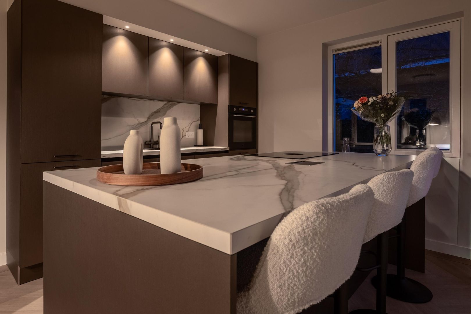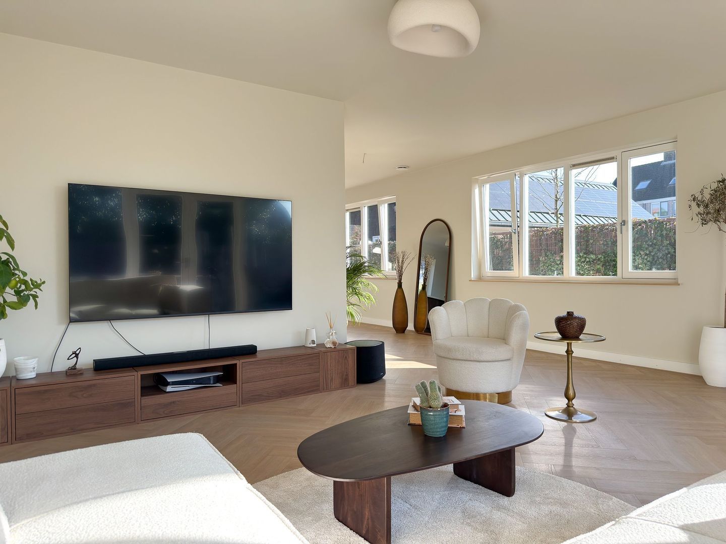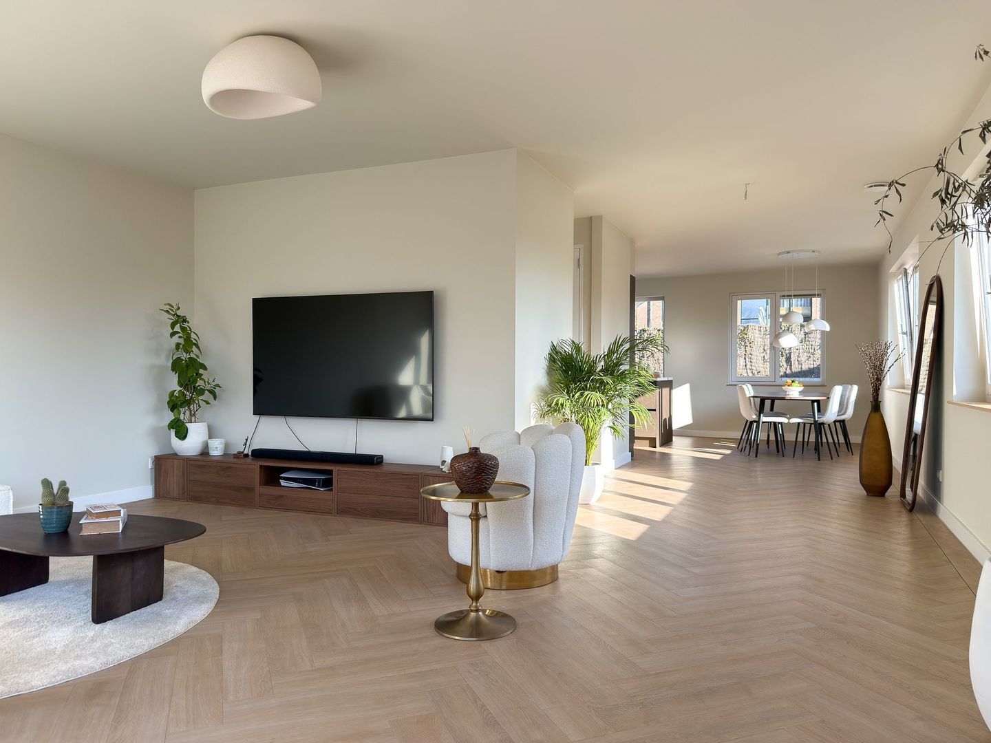 Binnen merk je direct dat alles nieuw is en met zorg is ingericht. De begane grond is één grote leefruimte met vloerverwarming en visgraatvloer, strakke strak afgewerkte wanden en grote ramen. Aan de voorzijde ligt de luxe keuken met kookeiland, voorzien van moderne inbouwapparatuur en veel werk- en bergruimte. Hier kun je uitgebreid koken terwijl je gasten aan het bargedeelte of aan de eettafel aanschuiven. De eetkamer loopt mooi over in de woonkamer aan de tuinkant, waar de openslaande deuren naar het terras zorgen voor extra licht en een directe verbinding met buiten. Het geheel voelt ruim, rustig en comfortabel.