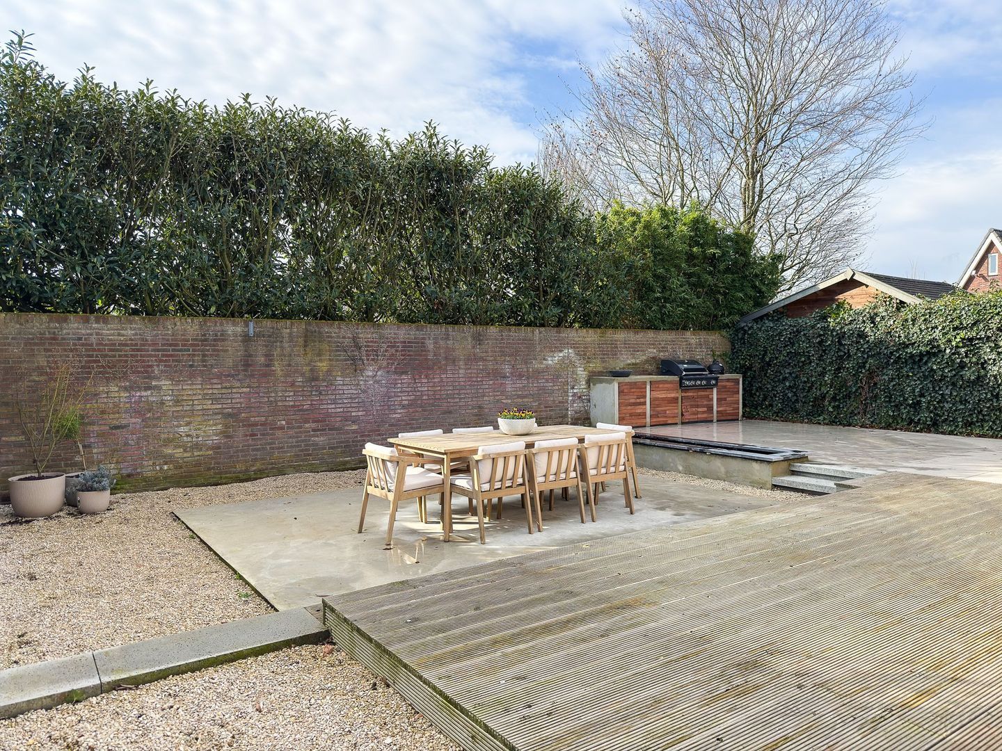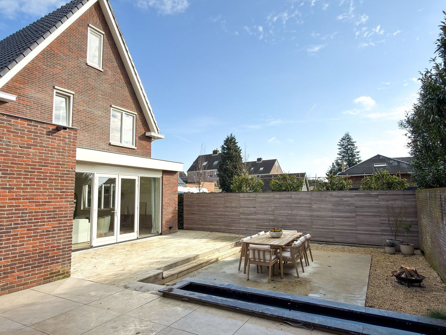 De tuin ligt rondom de woning en is modern en onderhoudsvriendelijk aangelegd. Met een vlonderterras direct bij de woonkamer, een lagergelegen terras (beton) en een betegeld terras heb je volop keuze waar jij gaat zitten om van het buitenleven te genieten. Door de schutting en het groen geniet je veel privacy en via de zijkant van het perceel heb je een handige achterom. De oprit en garage maken dat je op eigen terrein kunt parkeren.