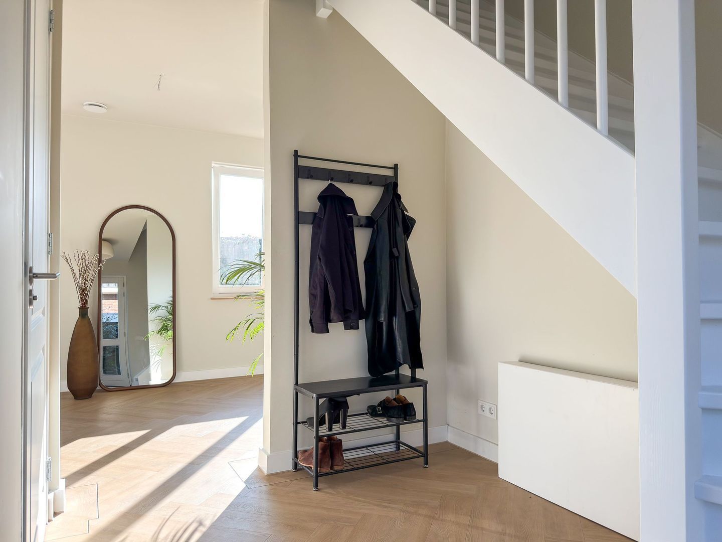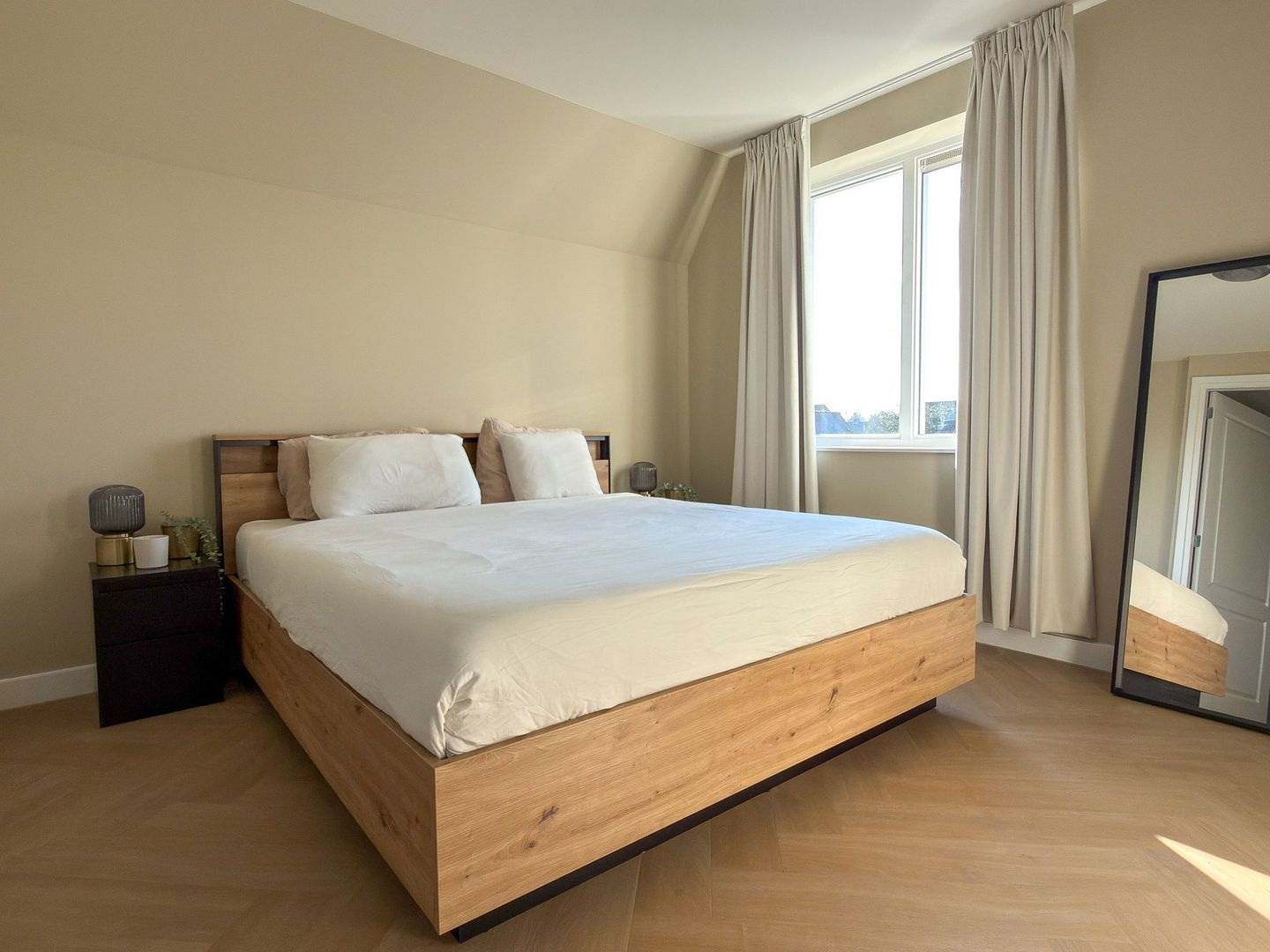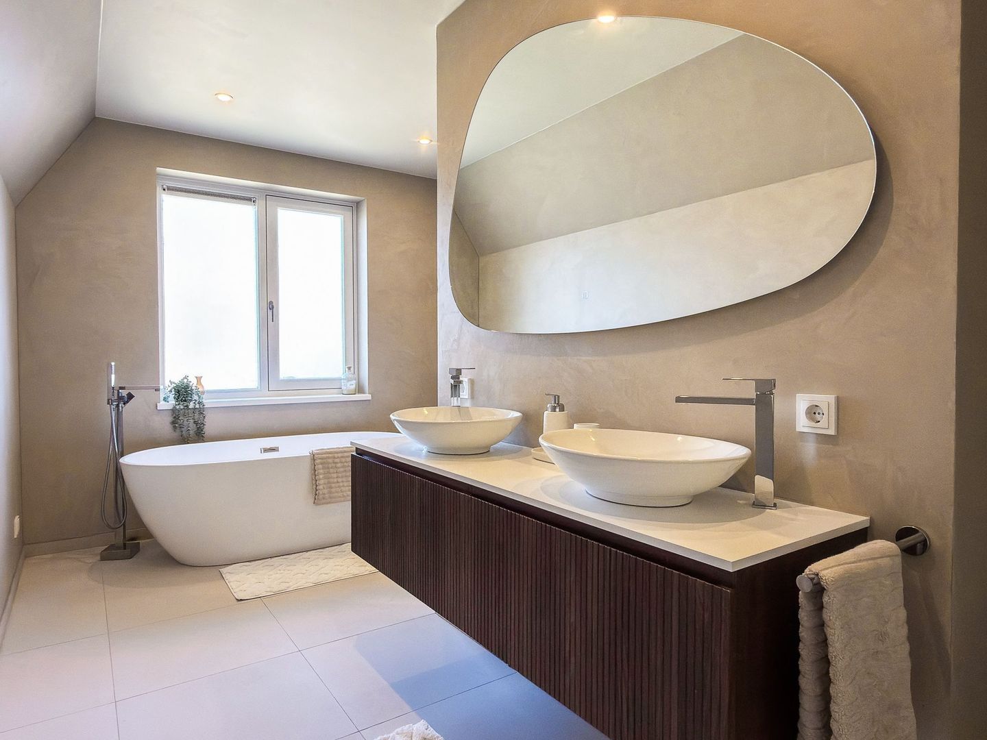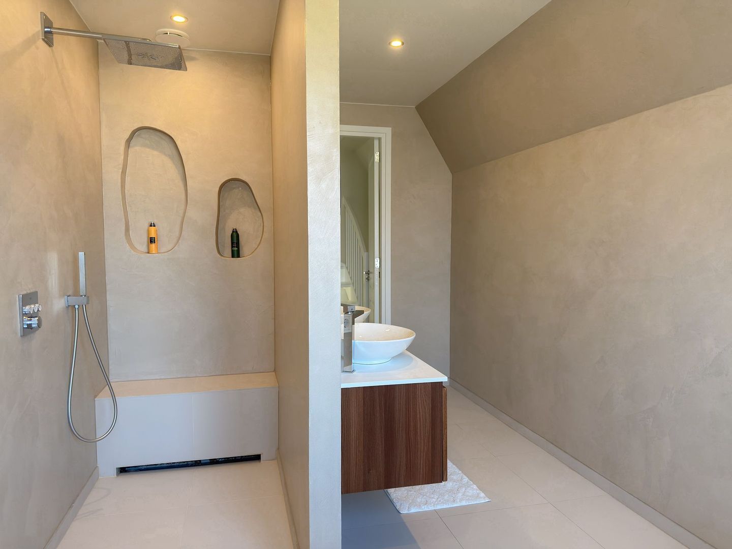 Op de eerste verdieping gaat dat gevoel van ruimte en luxe verder. Je hebt hier twee grote slaapkamers, waarvan één met een royale inloopkast. Ook is er een aparte wasruimte zodat de was altijd uit het zicht blijft. De badkamer is een echte blikvanger: strak gestuukte wanden met beton ciré, een vrijstaand ligbad, een inloopdouche, dubbele wastafel en een toilet maken dit tot een plek waar je graag de dag begint en eindigt. Alles is uitgevoerd in rustige, warme tinten en vormt één geheel met de stijl van de rest van het huis. Ook op deze verdieping is vloerverwarming aangelegd.