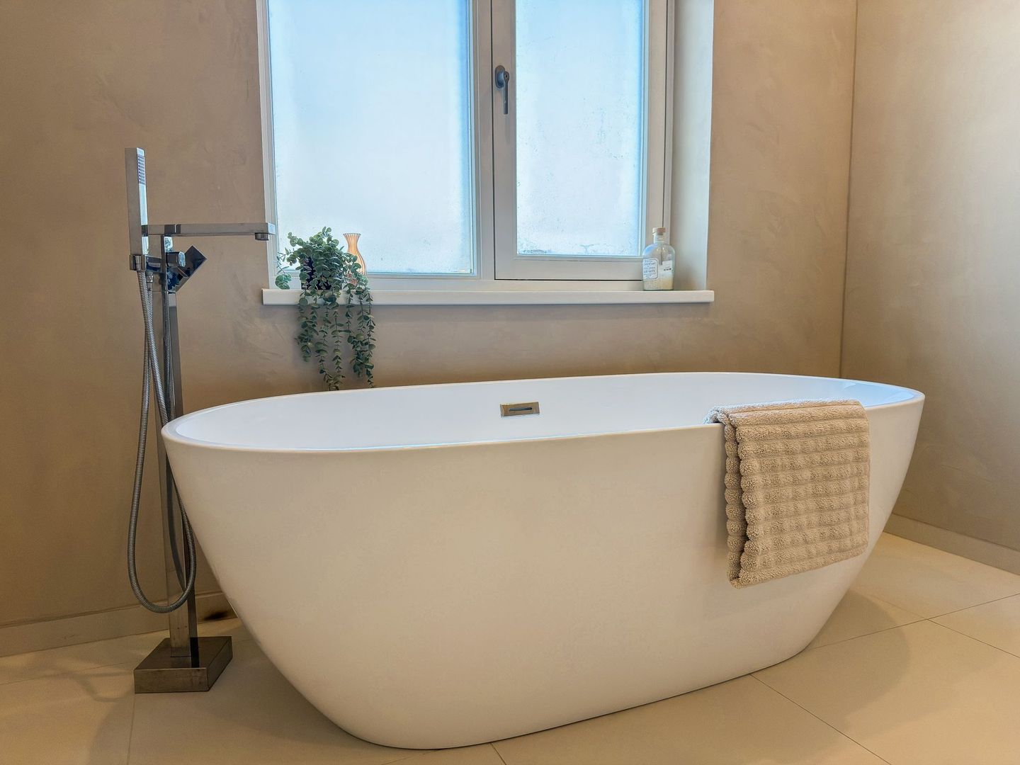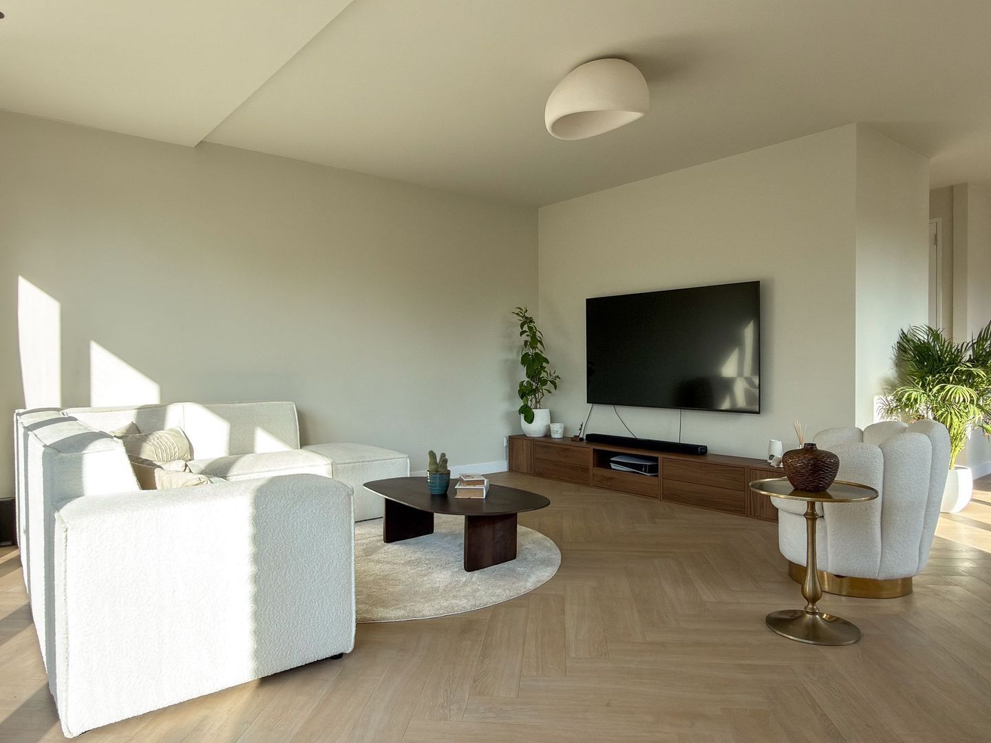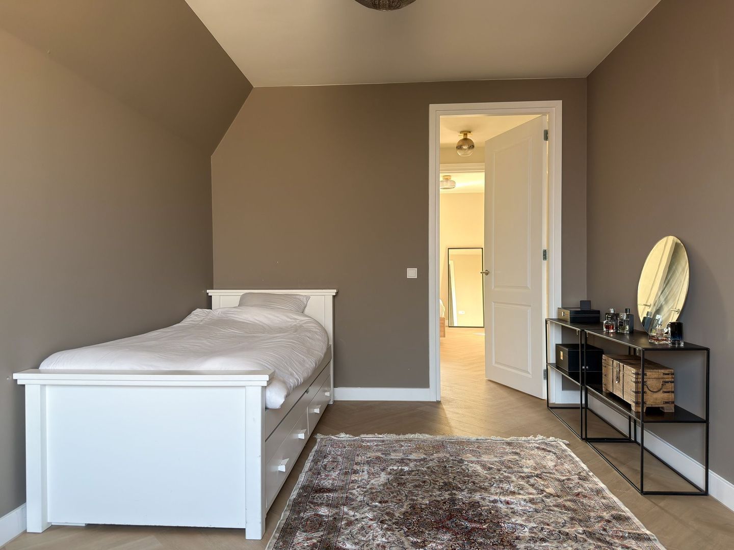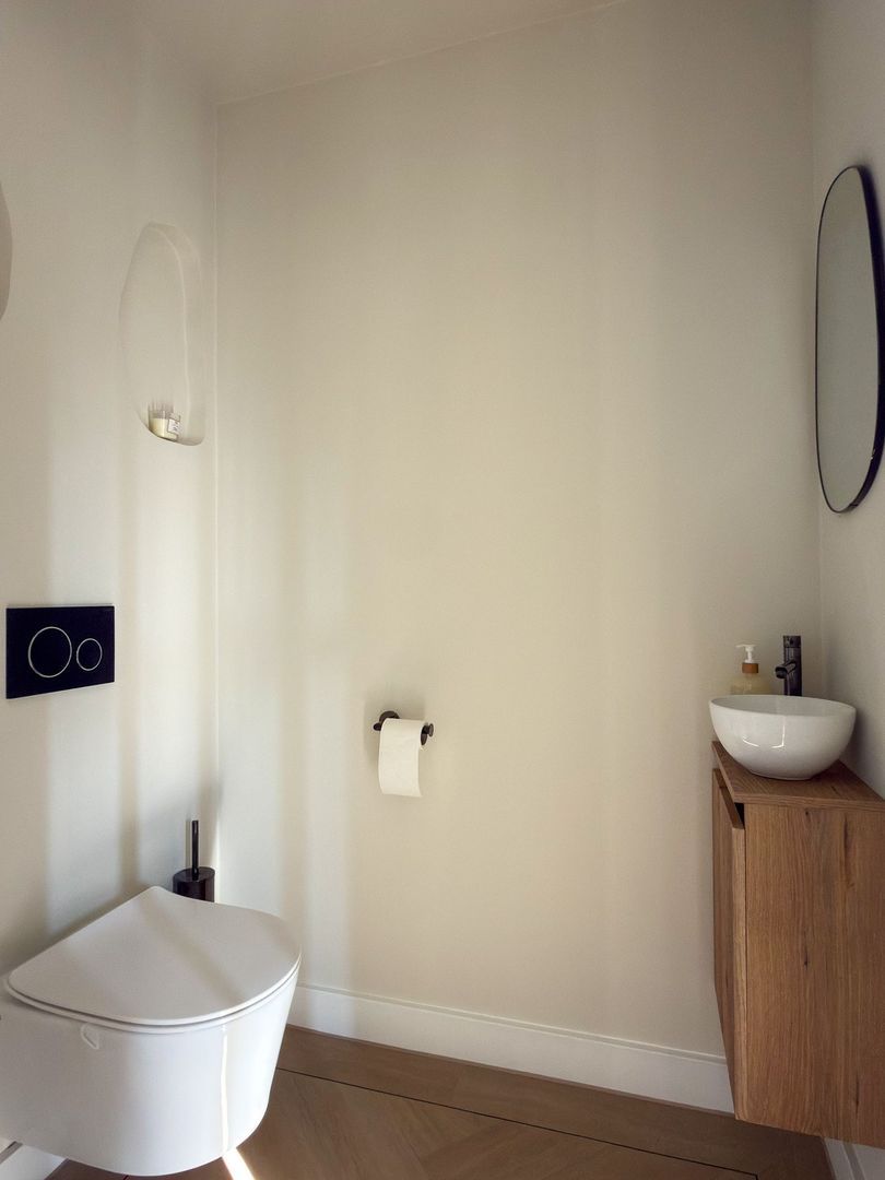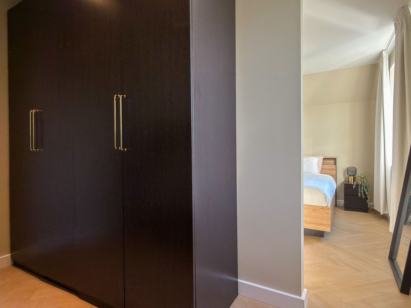 Op de eerste verdieping gaat dat gevoel van ruimte en luxe verder. Je hebt hier twee grote slaapkamers, waarvan één met een royale inloopkast. Ook is er een aparte wasruimte zodat de was altijd uit het zicht blijft. De badkamer is een echte blikvanger: strak gestuukte wanden met beton ciré, een vrijstaand ligbad, een inloopdouche, dubbele wastafel en een toilet maken dit tot een plek waar je graag de dag begint en eindigt. Alles is uitgevoerd in rustige, warme tinten en vormt één geheel met de stijl van de rest van het huis. Ook op deze verdieping is vloerverwarming aangelegd.