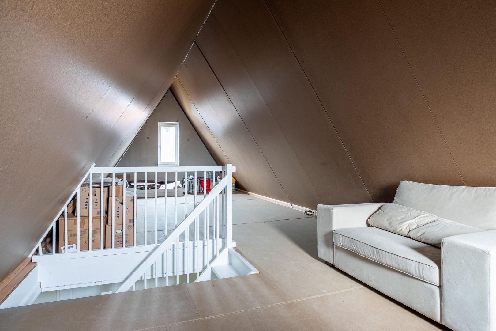 De tweede verdieping bereik je via een vaste trap en hier ligt een grote, open ruimte die nu wordt gebruikt voor opslag. Door de hoogte, het daglicht en de vorm van het dak kun je deze verdieping eenvoudig indelen tot één of meerdere kamers.