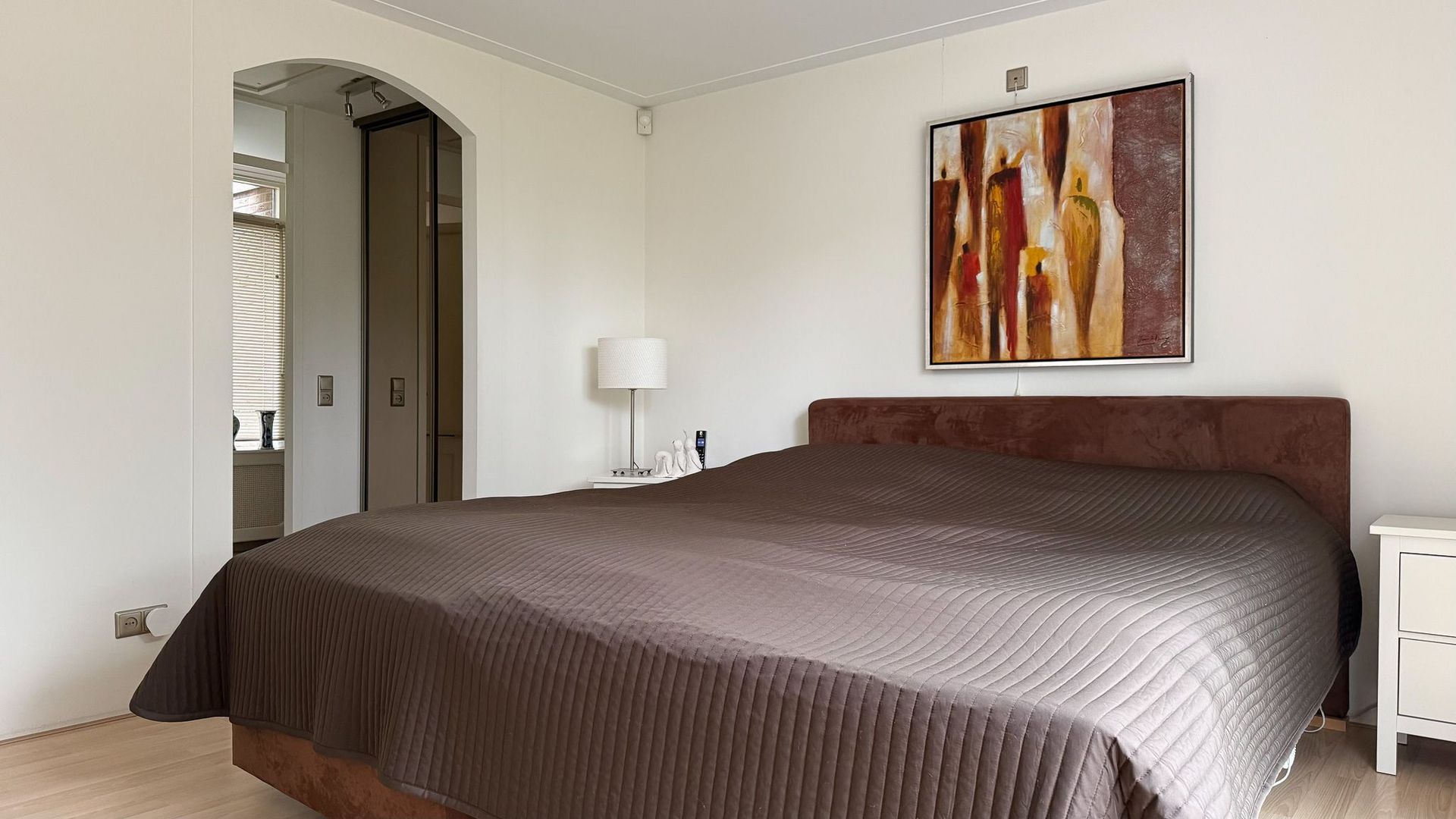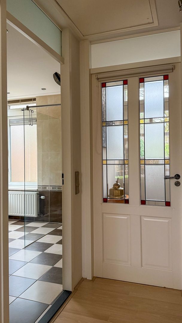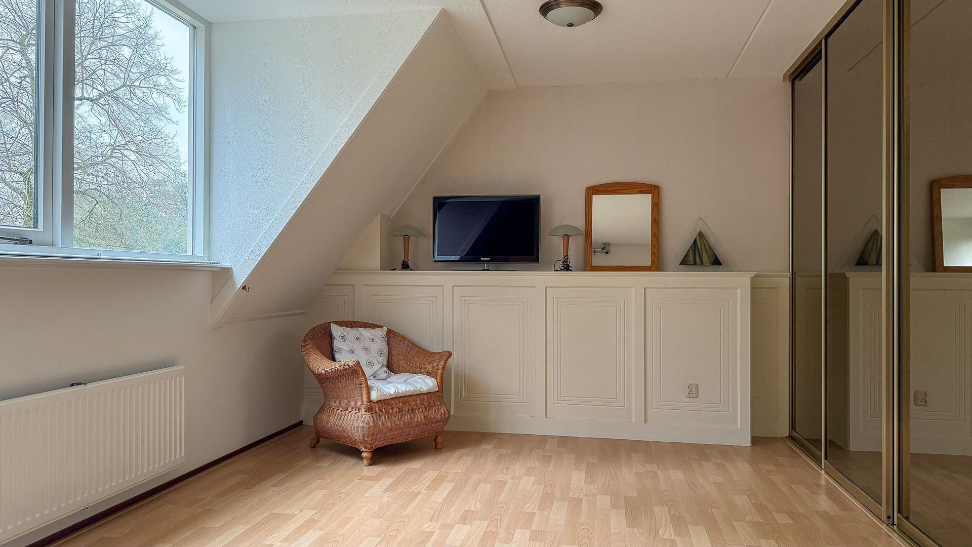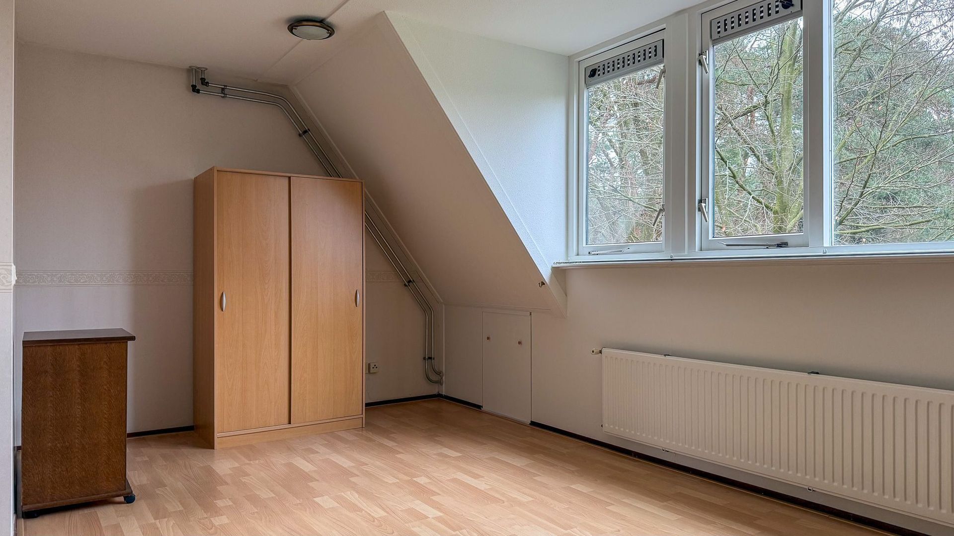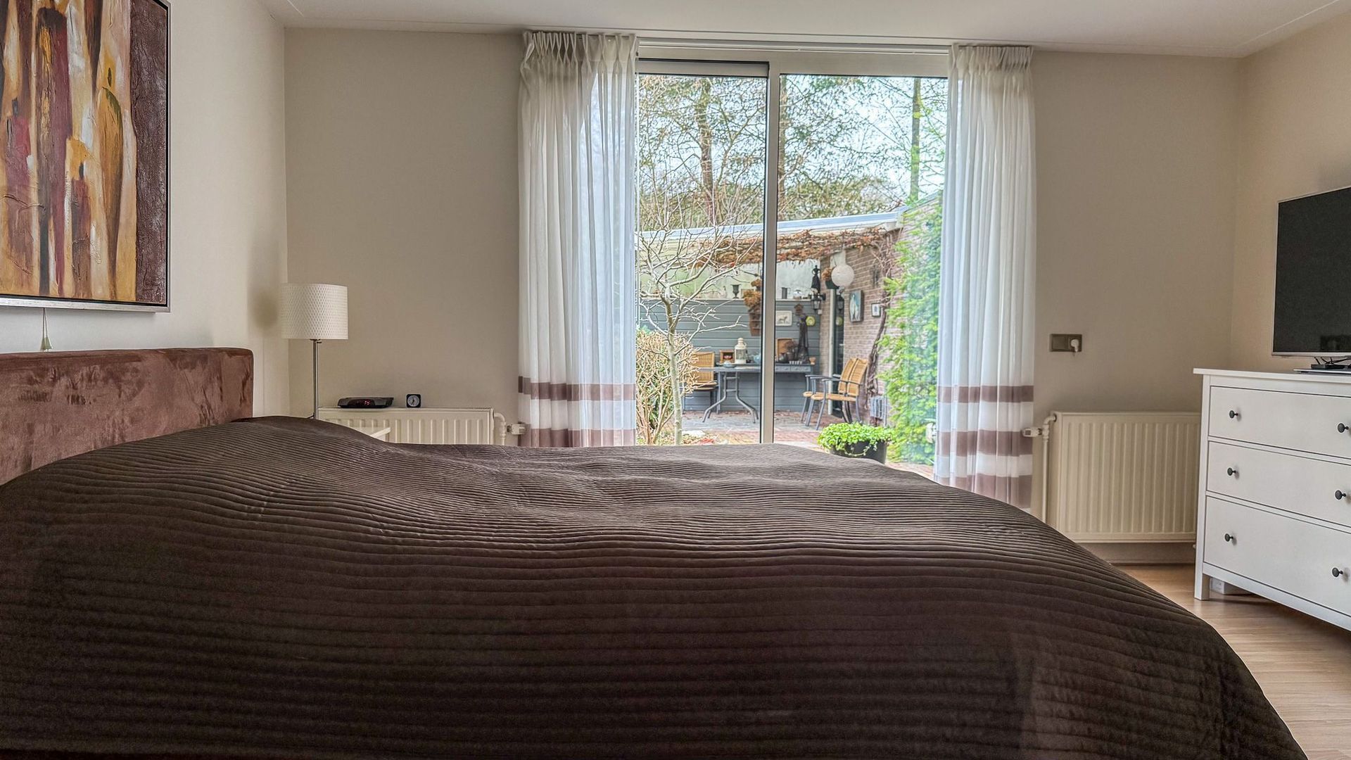Een belangrijk pluspunt van deze woning is de mooie slaapkamer op de begane grond. Dit is een lichte, prettige kamer met een vaste kast en een schuifdeur naar de tuin. Vanuit de slaapkamer kun je de bergzolder bereiken doormiddel van een vlizotrap, ideaal voor het opbergen van spullen. Door de schuifpui en de ligging voelt deze kamer licht en ruimtelijk aan – ideaal als slaapkamer, maar ook als bijvoorbeeld werk- of hobbykamer. Aangrenzend aan de slaapkamer ligt de badkamer. Deze is voorzien van een inloopdouche, een wasmeubel en een toilet.