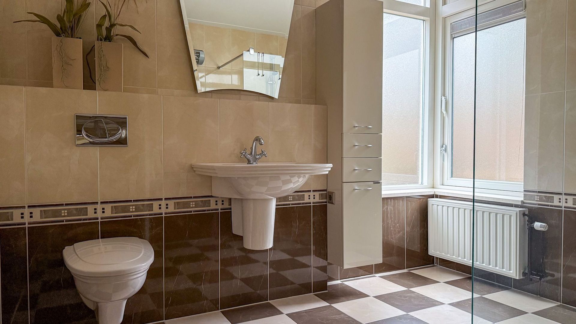 Boven kom je op een overloop die toegang geeft tot twee slaapkamers, waarvan één zeer royaal en voorzien van vaste kasten, en de tweede badkamer. De badkamer is ingericht met wastafelmeubel, ligbad, douche en toilet.