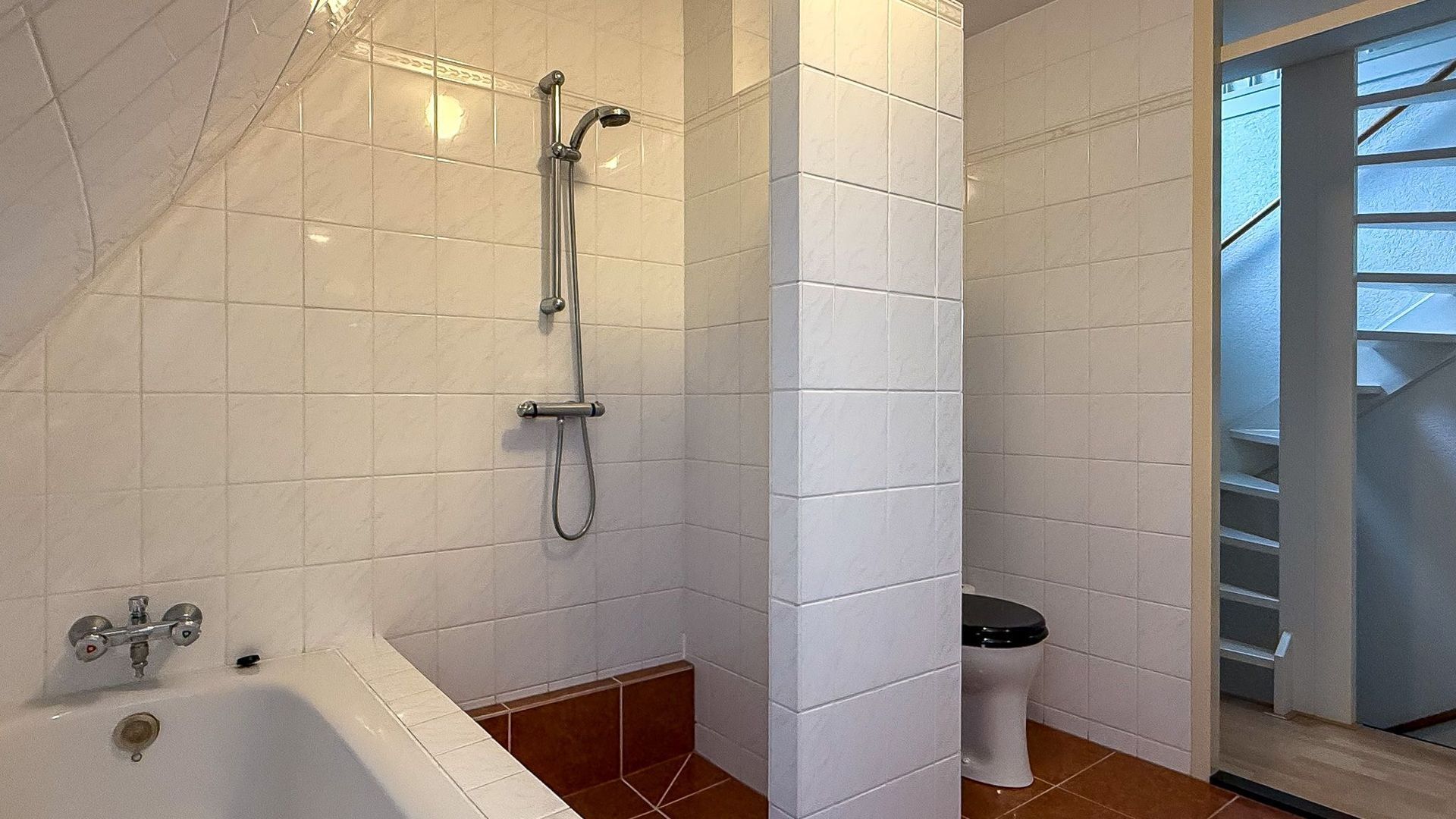 De badkamer op deze verdieping is compleet uitgevoerd met een wastafelmeubel, ligbad, inloopdouche en toilet.