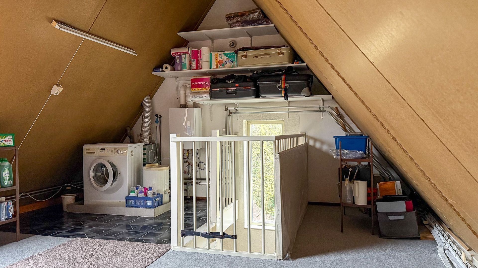 Via een vaste trap bereik je de tweede verdieping: een praktische extra ruimte die je kunt gebruiken als werkplek, hobbykamer of logeerkamer. Hier bevindt zich ook de wasmachine-aansluiting.