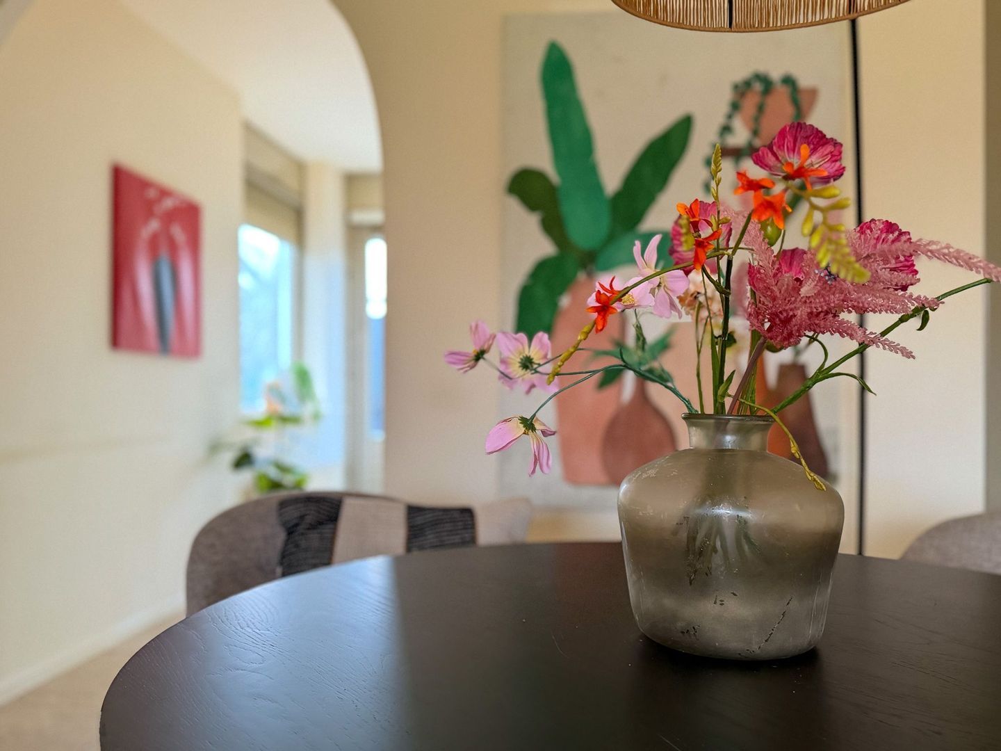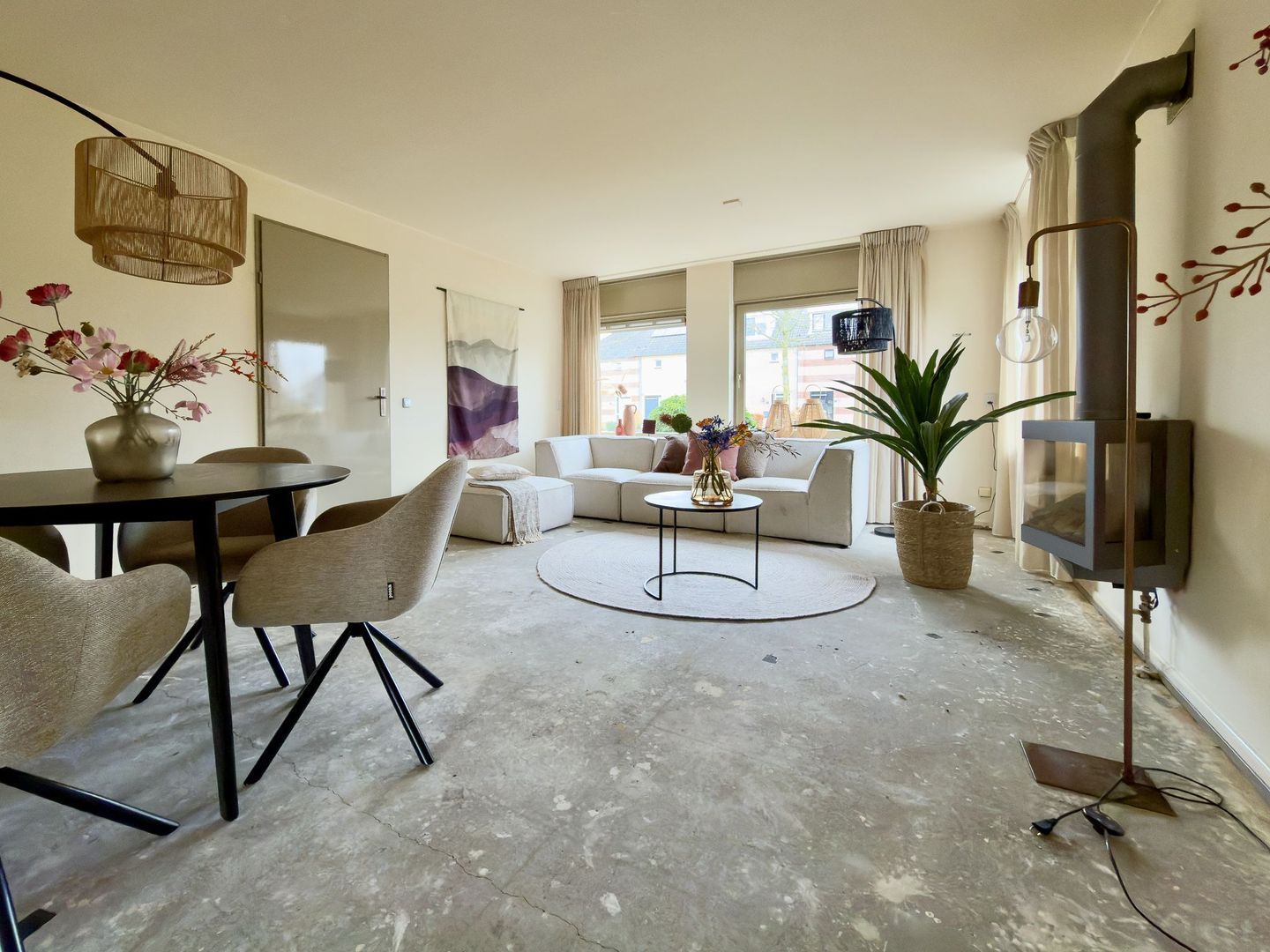 De lichte woonkamer ligt aan de voorzijde en biedt een plezierig uitzicht de straat in. De eethoek vormt de verbinding met de halfopen keuken.