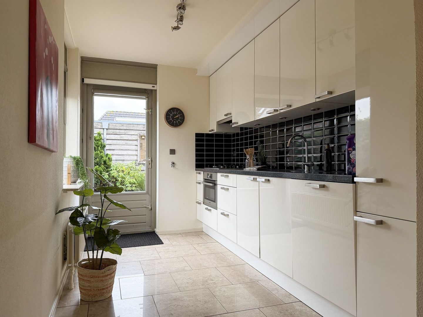 De hoogglans keuken biedt veel werk- en opbergruimte en is voorzien van de gebruikelijke inbouwapparatuur. Vanuit de keuken is de achtertuin toegankelijk.