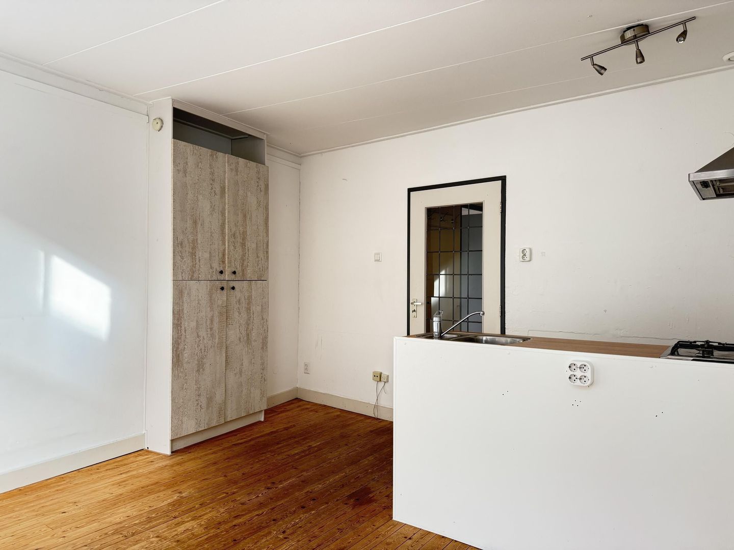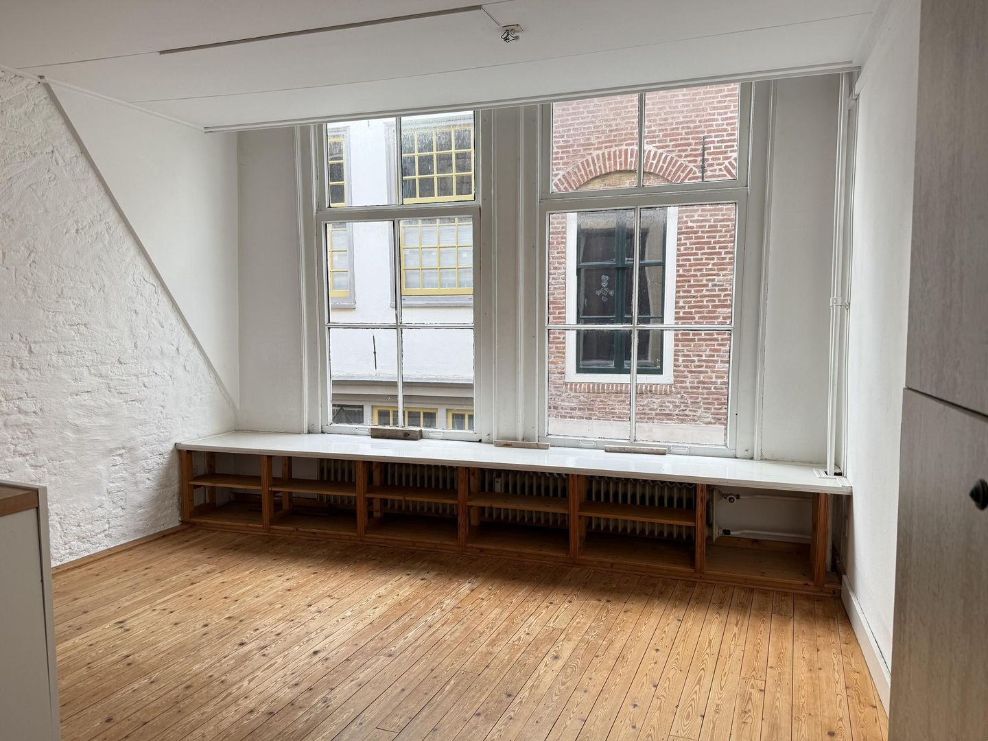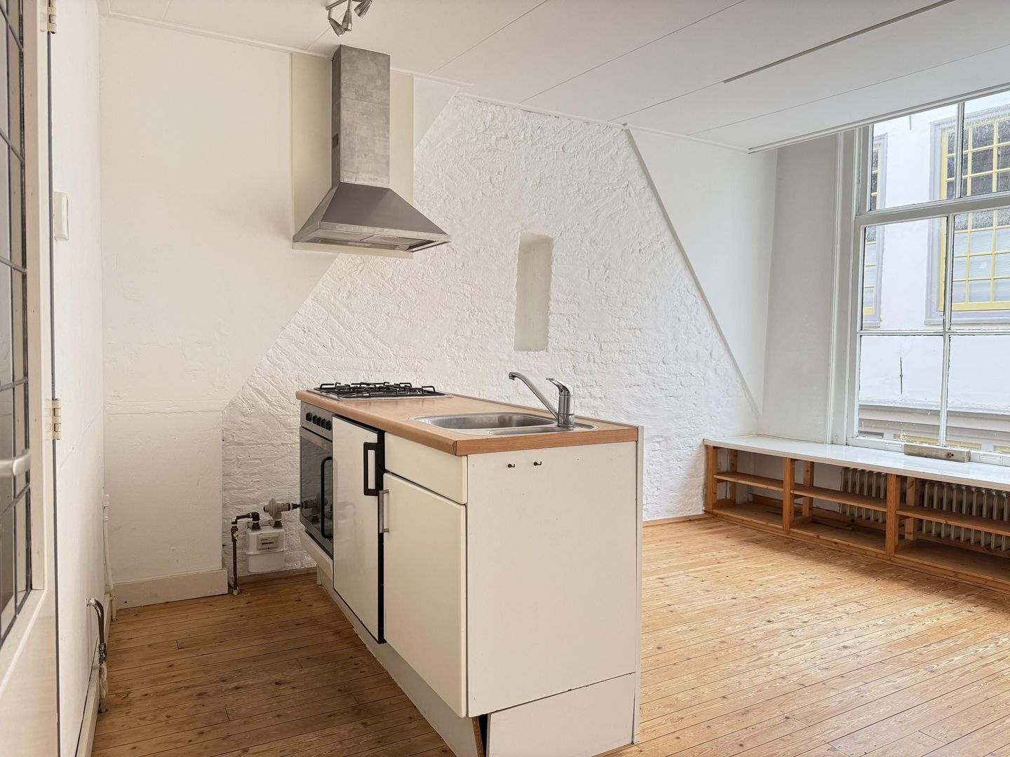 De woonkamer heeft een houten vloer, grote raamkozijnen en een brede vensterbank, heerlijk om in te zitten en naar de prachtige oude gebouwen en de kerktoren verderop in de straat te kijken. Het keukenblok is compact staat centraal in het appartement en voorzien van oven, koelkast met vriesvak, rvs-gootsteen, gaskookplaat en afzuigkap.