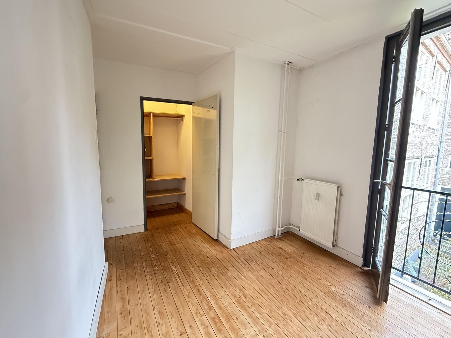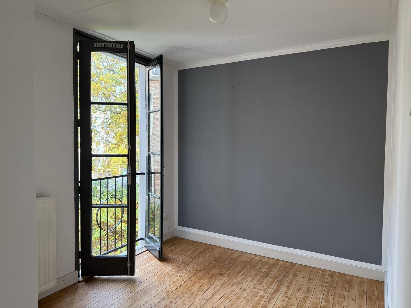 Direct rechts de slaapkamer met hoog plafond en een vaste kast voor je kleding en overige spullen. De kamerhoge openslaande deuren bij het Frans balkon geven uitzicht op de groene, ruime tuin van de buren en een prachtig naastgelegen historisch gebouw.