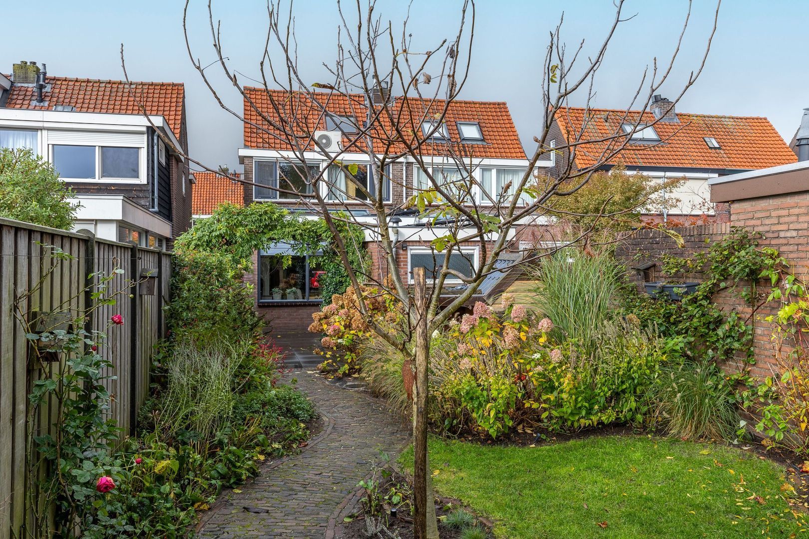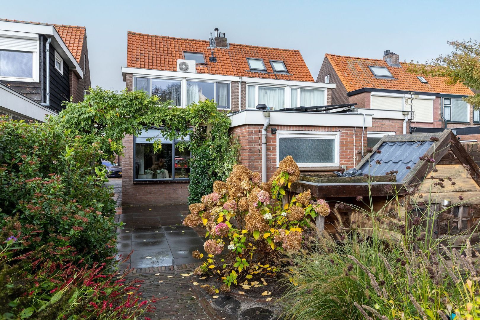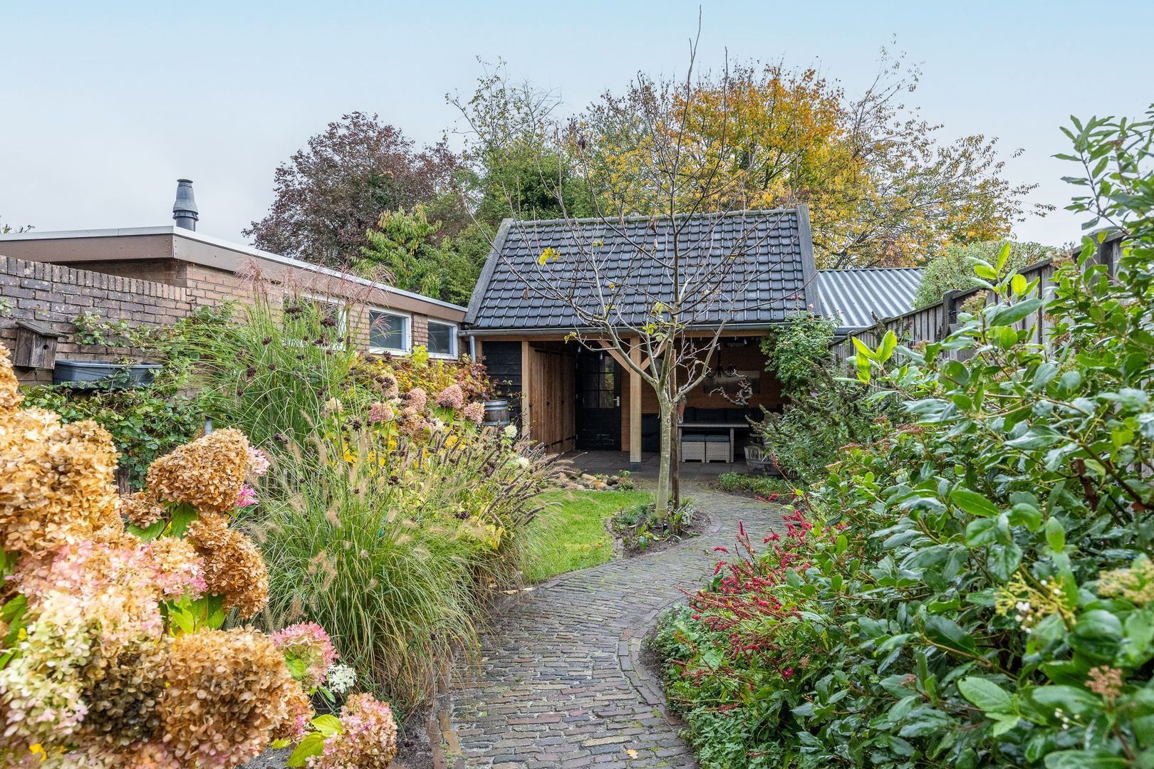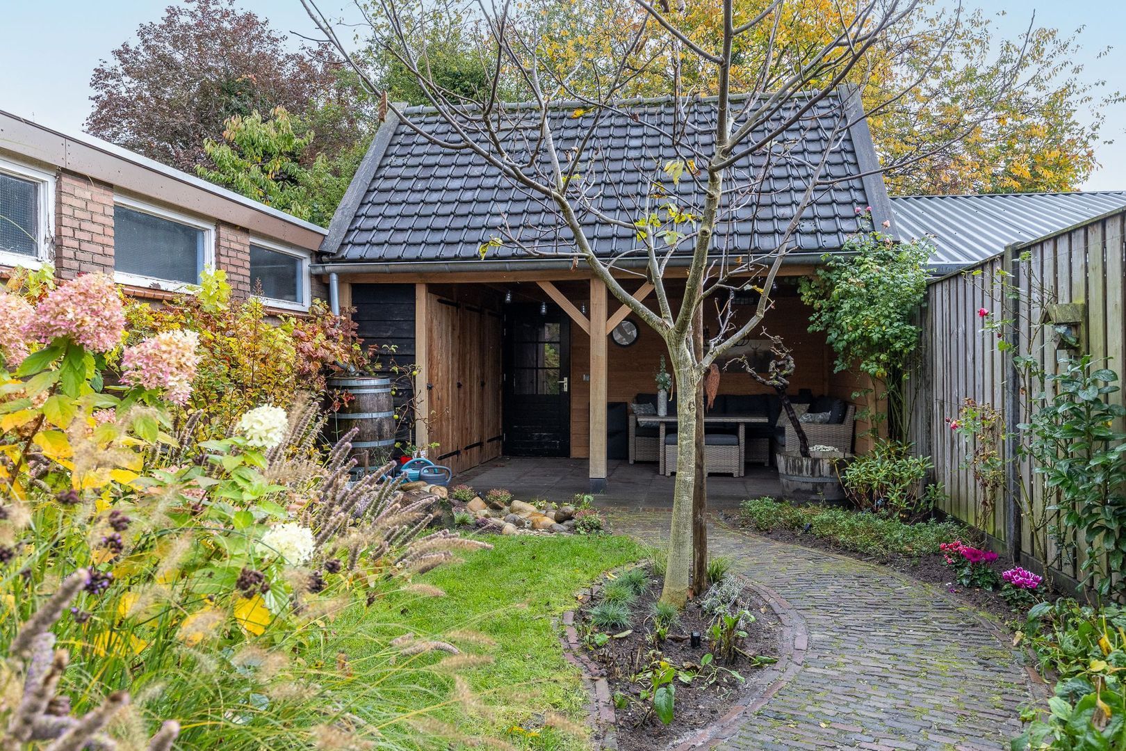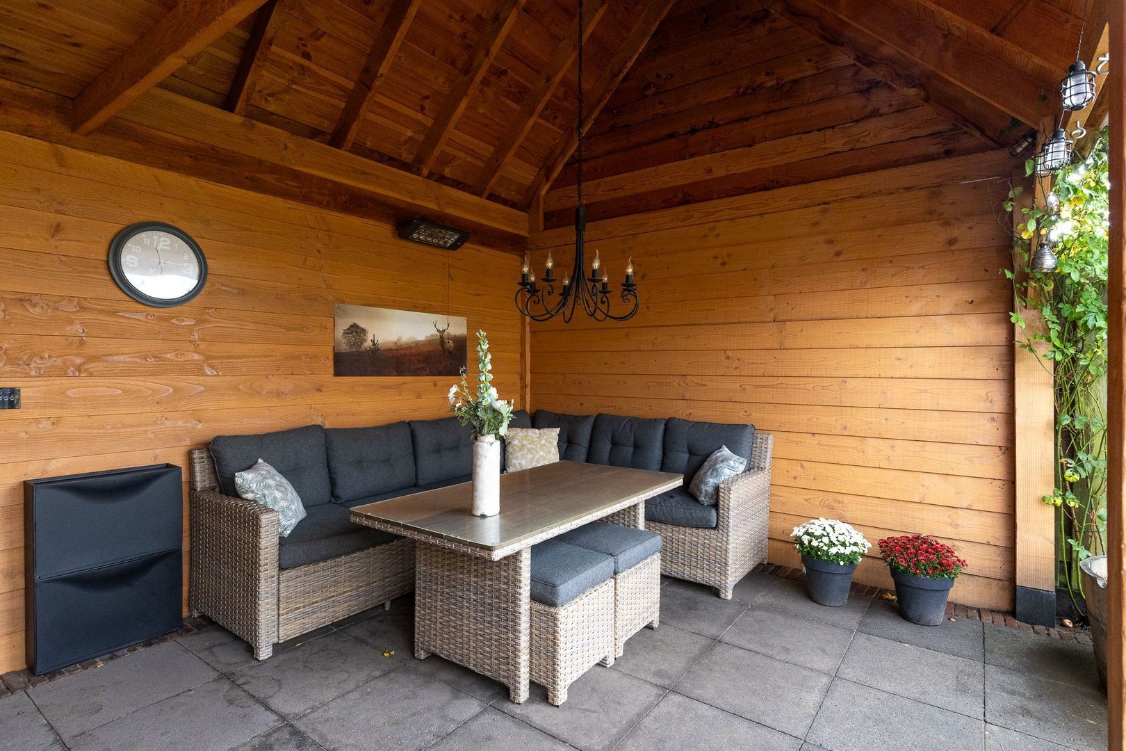 Ook buiten is het volop genieten. De achtertuin ligt gunstig op het zuidoosten en heeft een mooie afwisseling van groen en bestrating, waardoor er altijd wel een plekje in de zon of schaduw te vinden is. Achter op het perceel staat de vrijstaande schuur, een ruime en praktische plek waar je onder andere fietsen kunt stallen en (tuin)gereedschap kunt opbergen. De veranda vormt een eigentijdse buitenruimte waar je het hele jaar door kunt genieten van het buitenleven, of het nu gaat om een zomerse barbecue of een knusse avond met een plaid en wat sfeerverlichting.
