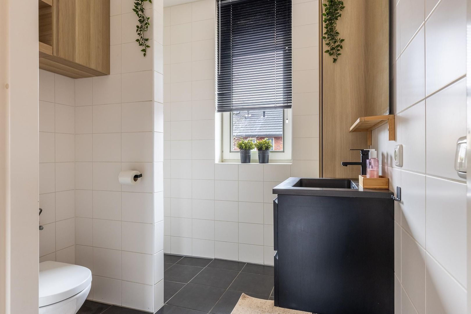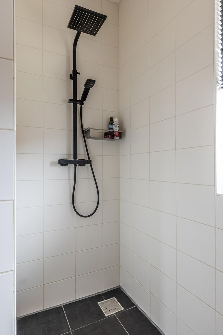 De badkamer is geheel betegeld, strak en praktisch ingericht en voorzien van een regendouche, wastafelmeubel en 2e toilet.