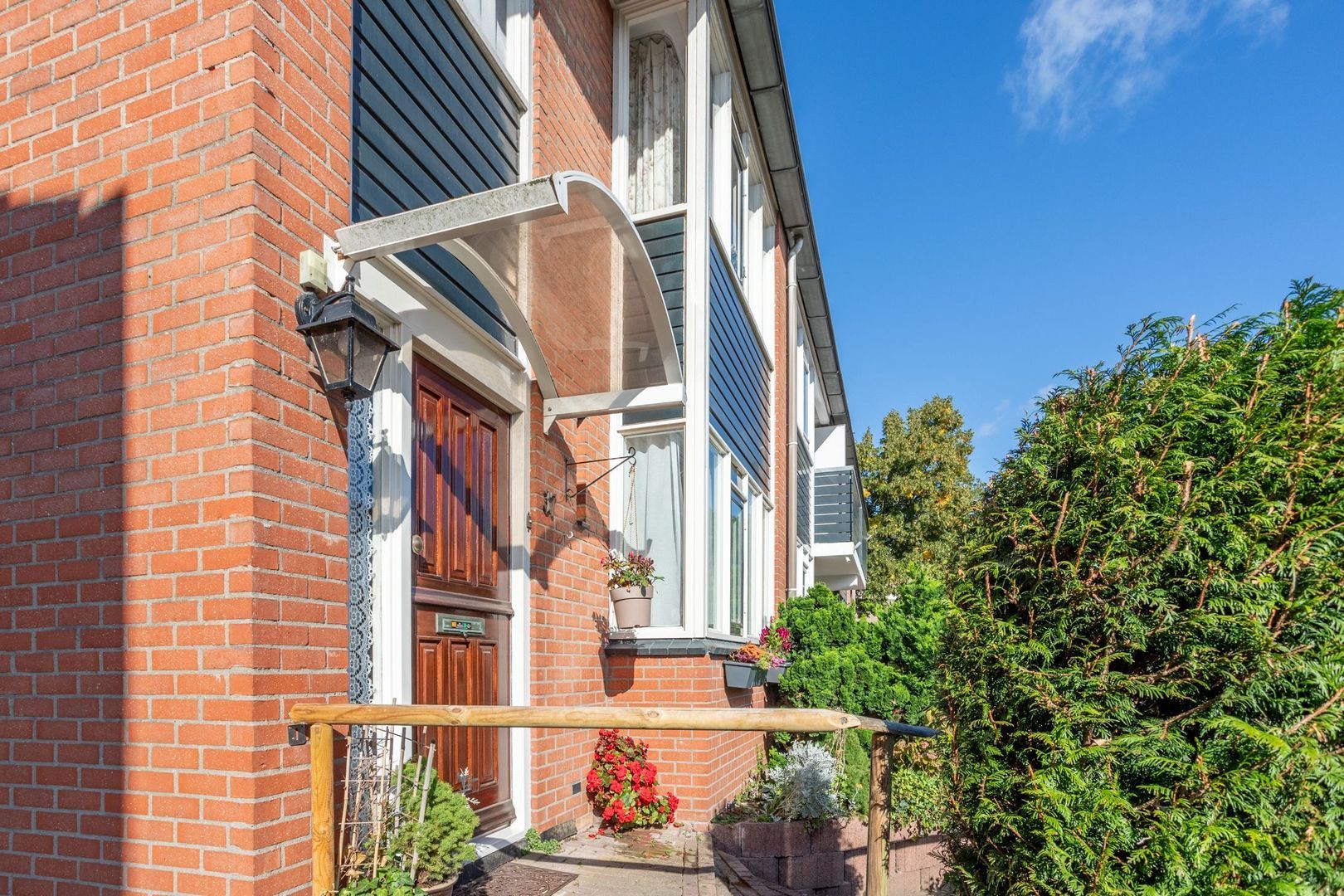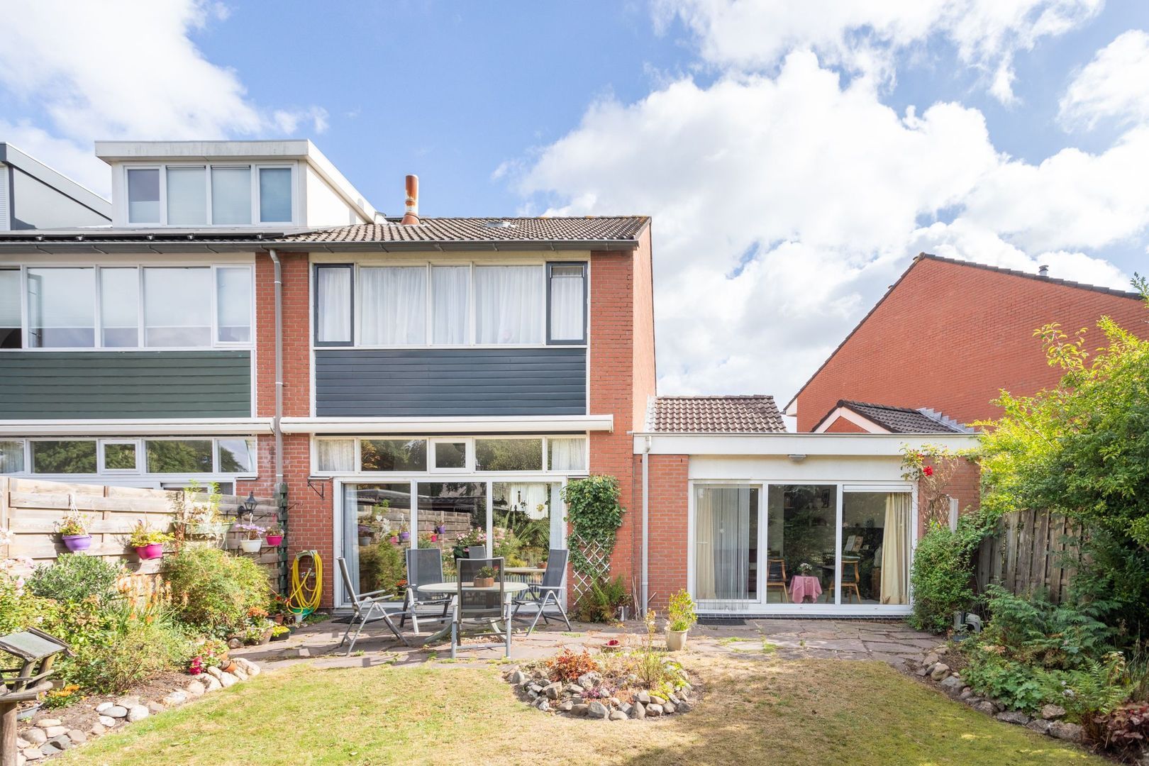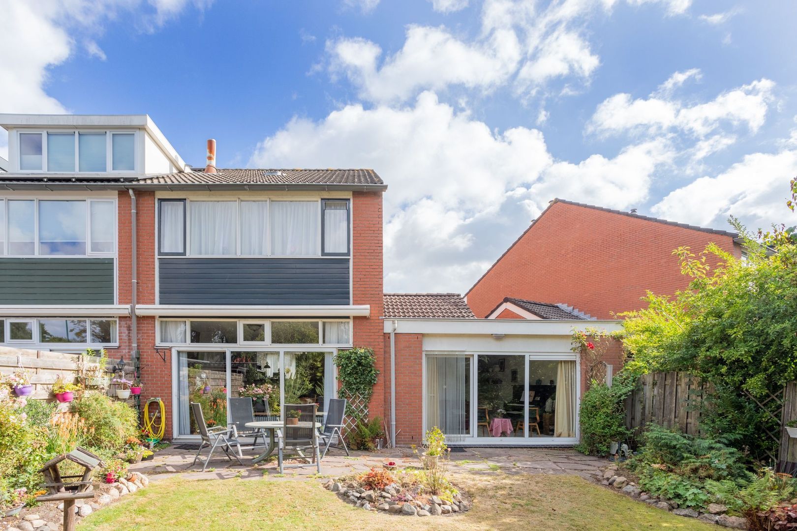 De achtertuin is royaal, heeft een mooie mix van gazon en beplanting en biedt privacy. Dankzij de ligging op het zuidwesten is er altijd een zonnig plekje te vinden, maar ook voldoende schaduw om op warme dagen te genieten.
