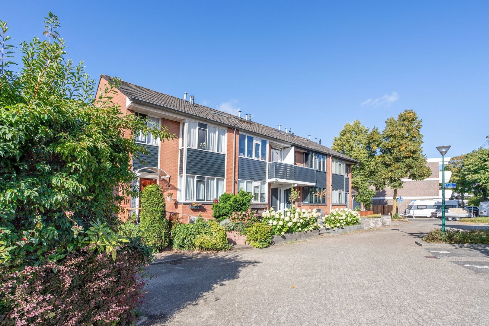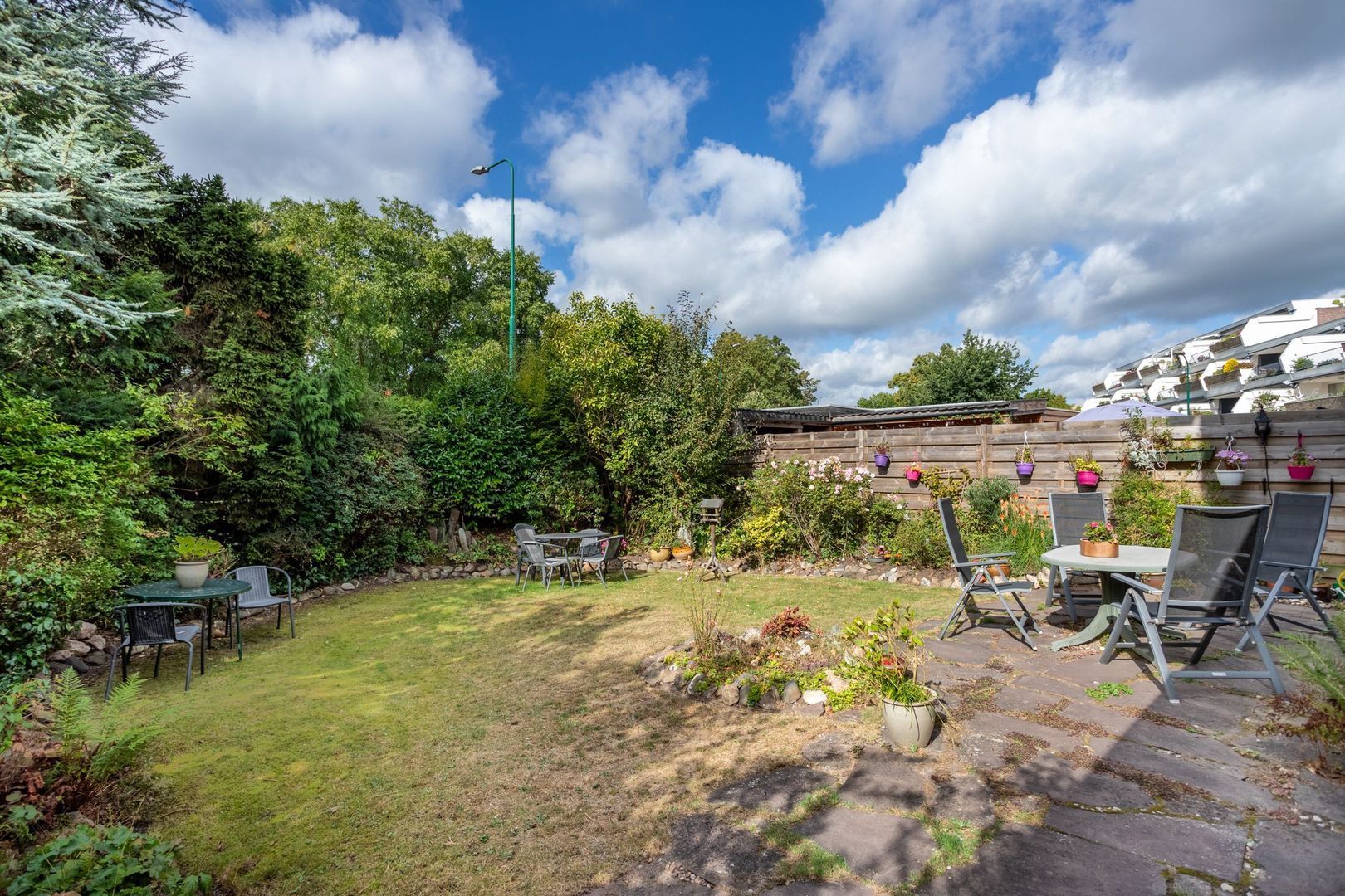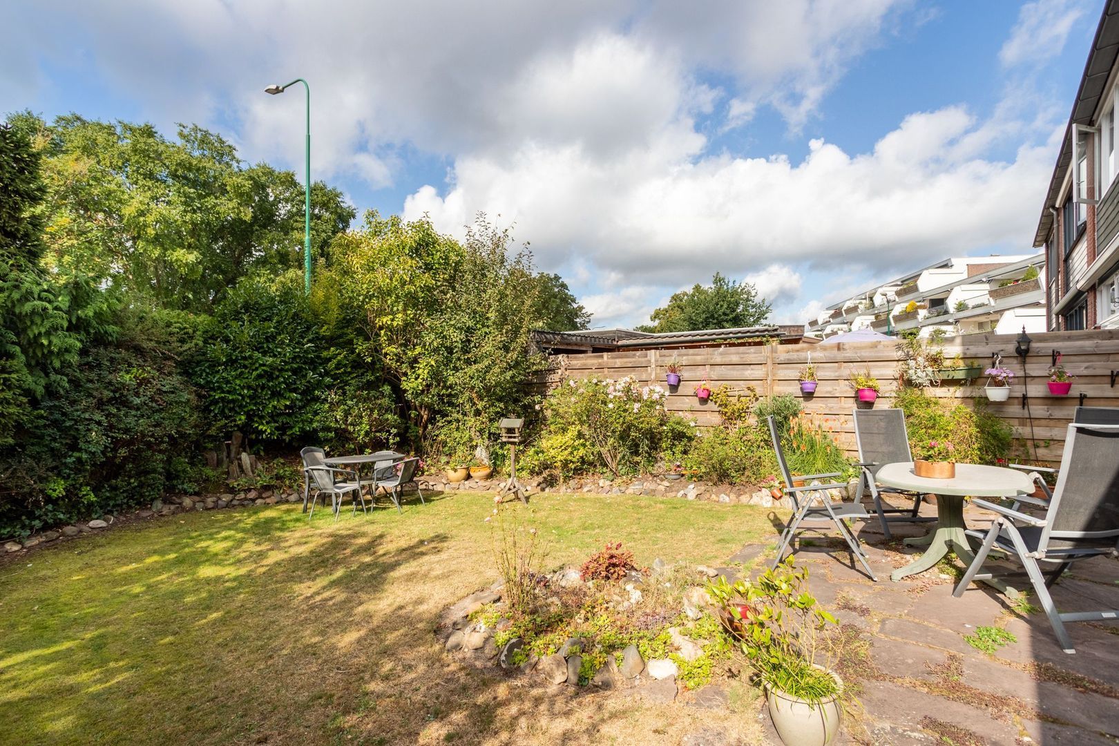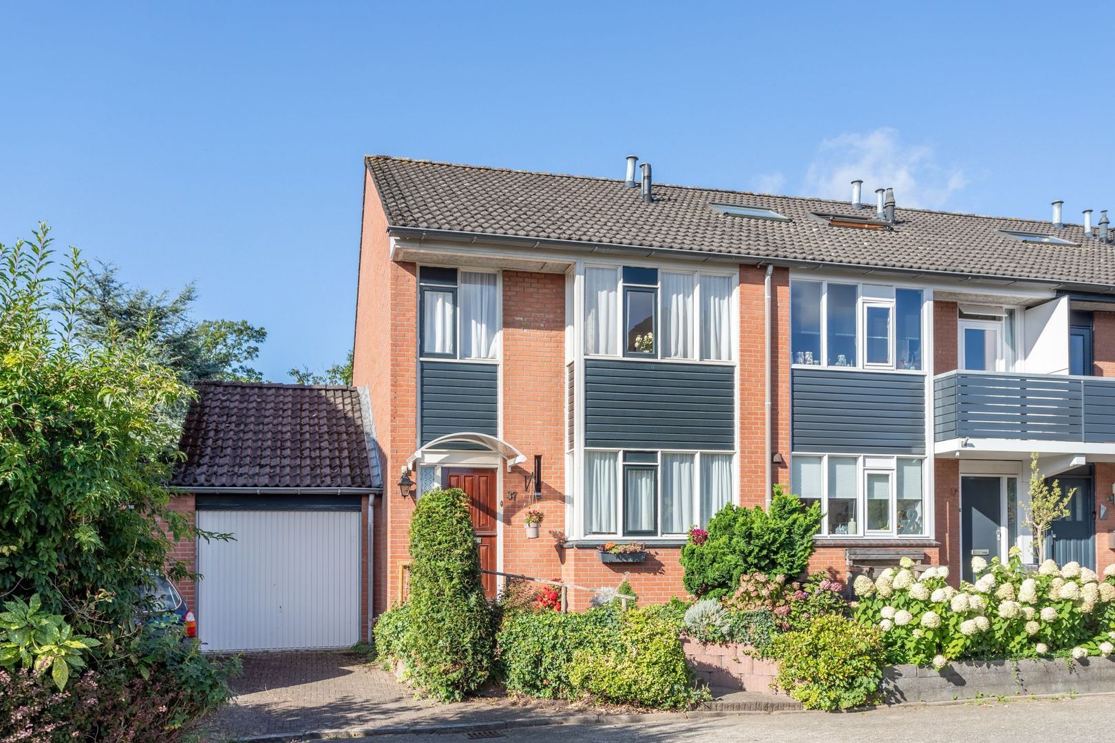 De achtertuin is royaal, heeft een mooie mix van gazon en beplanting en biedt privacy. Dankzij de ligging op het zuidwesten is er altijd een zonnig plekje te vinden, maar ook voldoende schaduw om op warme dagen te genieten.