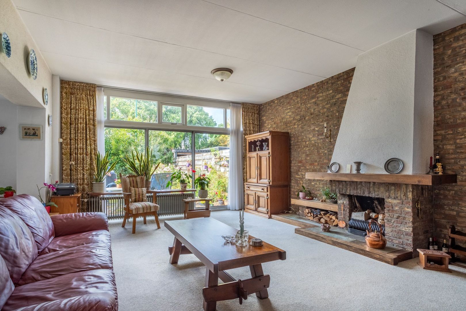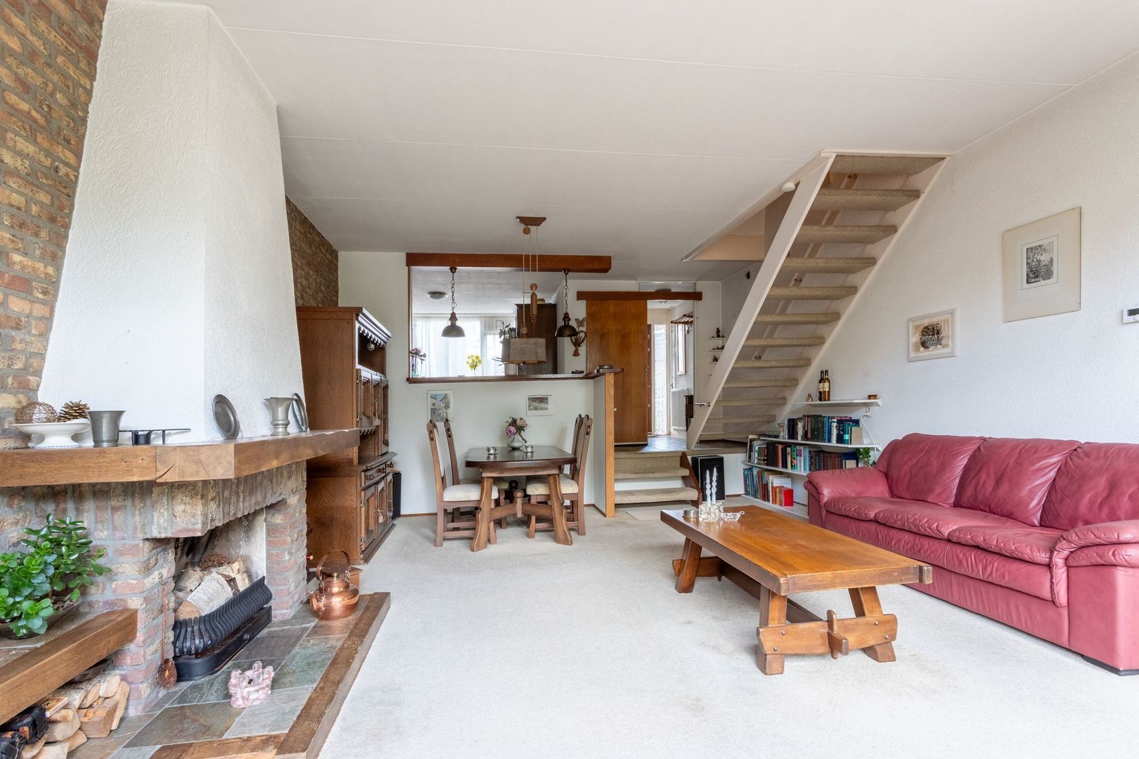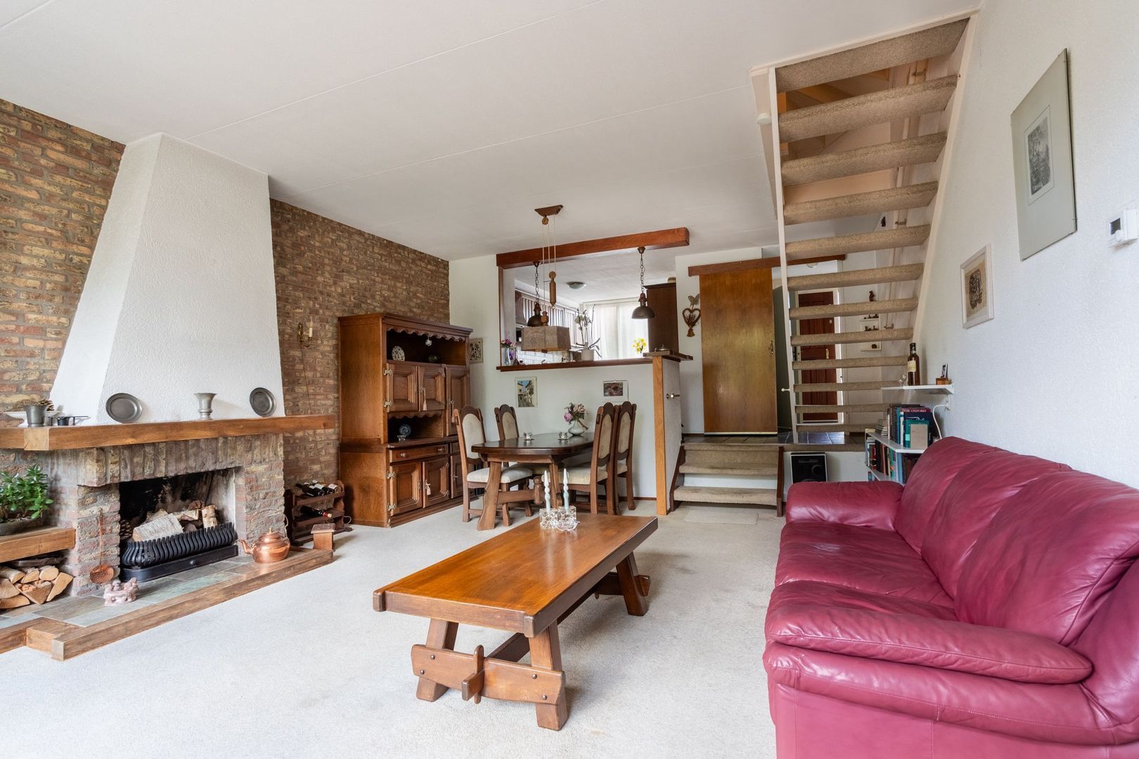 Je stapt binnen in de hal met meterkast, toilet en toegang tot de woonruimte. De keuken ligt aan de voorzijde van de woning en voorzien van een eenvoudig keukenblok. Vervolgens loop je via een klein trap naar de woonkamer, opgesplitst in twee delen en voorzien van een open haard en schuifpui naar de achtertuin. Via de woonkamer heb je ook toegang naar de inpandige garage.