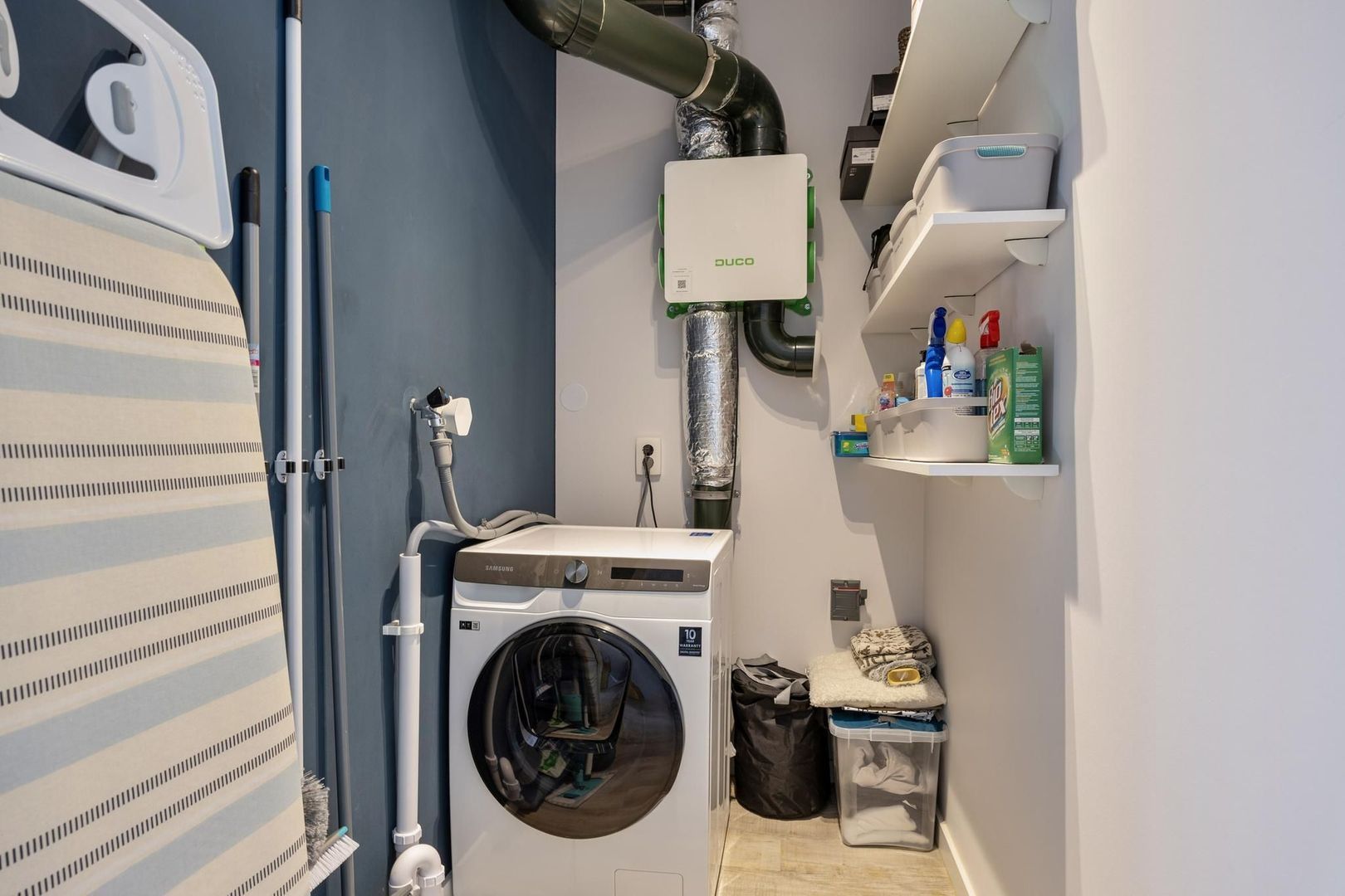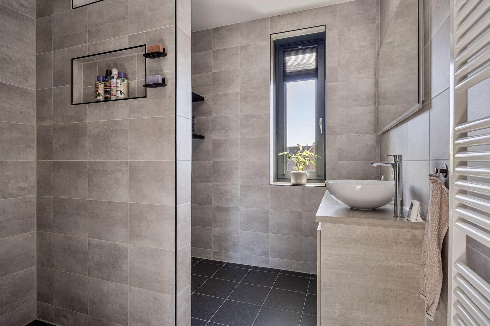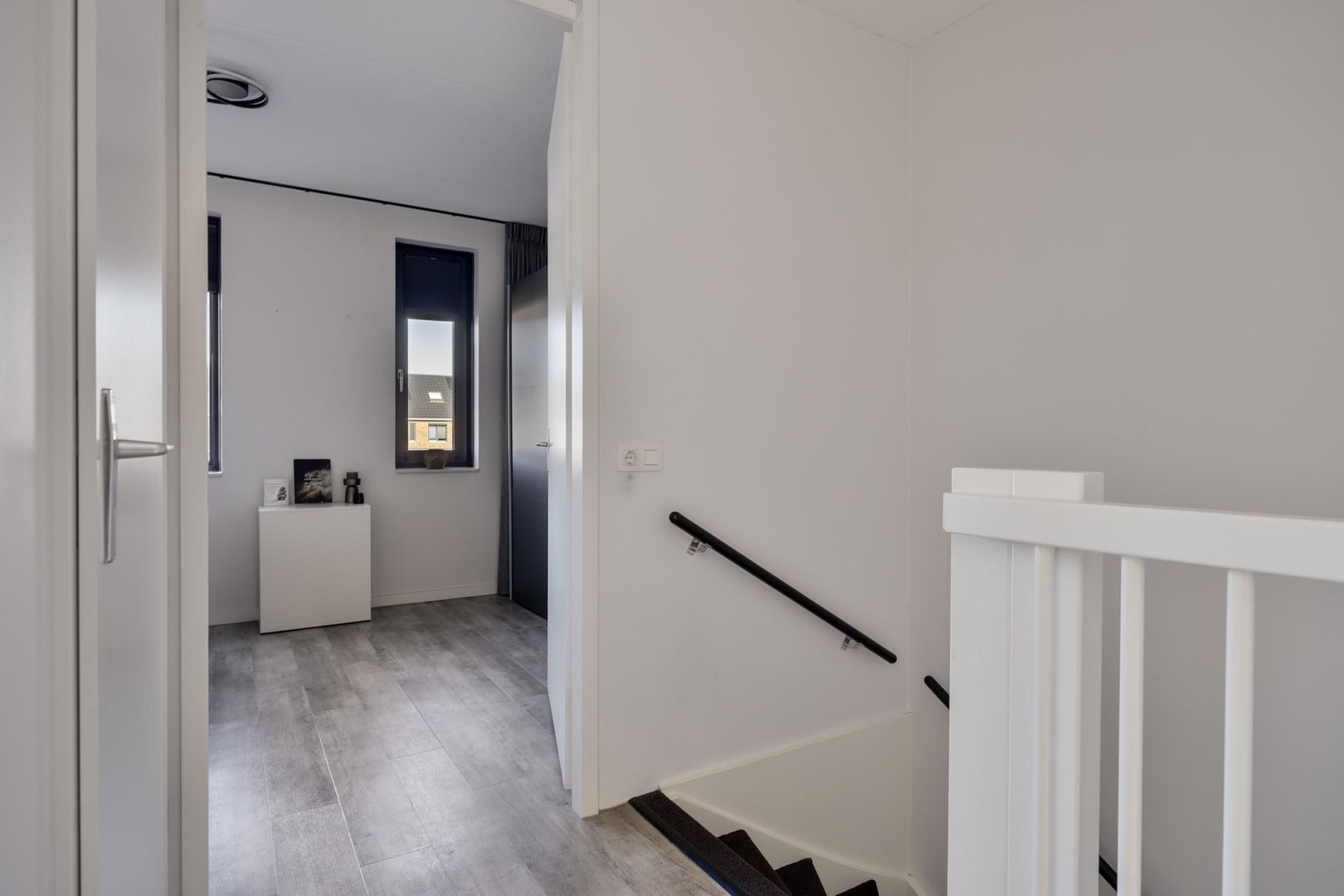 Op de eerste verdieping vind je twee slaapkamers, waaronder de ruime ouderslaapkamer. De tweede slaapkamer is ideaal als logeerkamer, kinderkamer of thuiskantoor. De badkamer is voorzien van een moderne inloopdouche en een wastafelmeubel met daarboven een touche spiegel. De hoogwaardige afwerking en het gebruik van neutrale tinten zorgen voor een tijdloze uitstraling. Daarnaast is er nog een praktische ruimte met de aansluiting voor de wasmachine plus extra bergruimte.