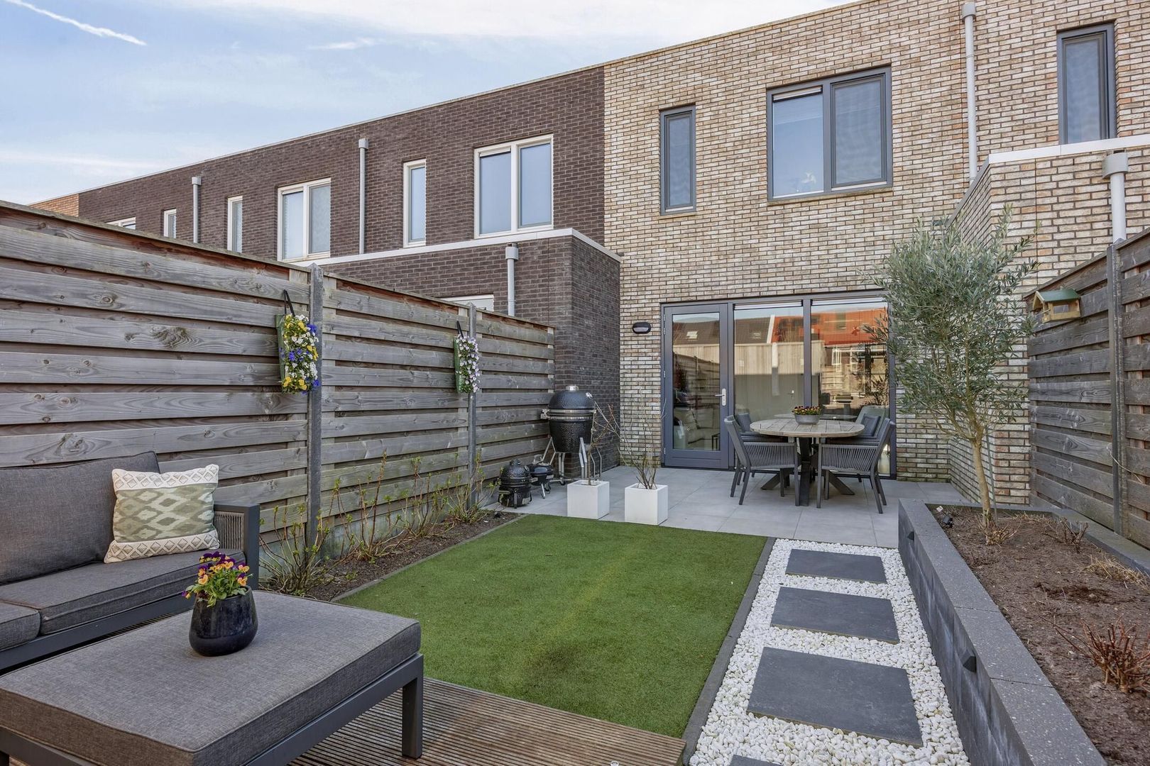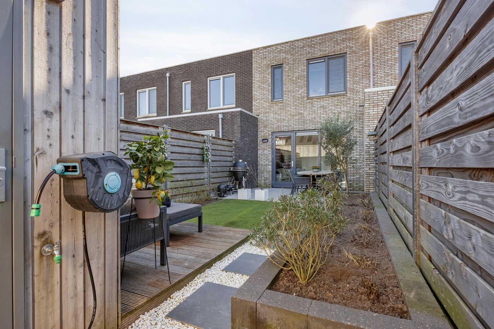 De ligging van de achtertuin is op het noordoosten maar door de open ligging, geniet je ook hier een groot gedeelte van de dag van de zon. De tuin is smaakvol aangelegd met een goede mix van groen en terras, waardoor het een ideale plek is om te ontspannen, te tuinieren of te genieten van een gezellige avond met vrienden en familie.